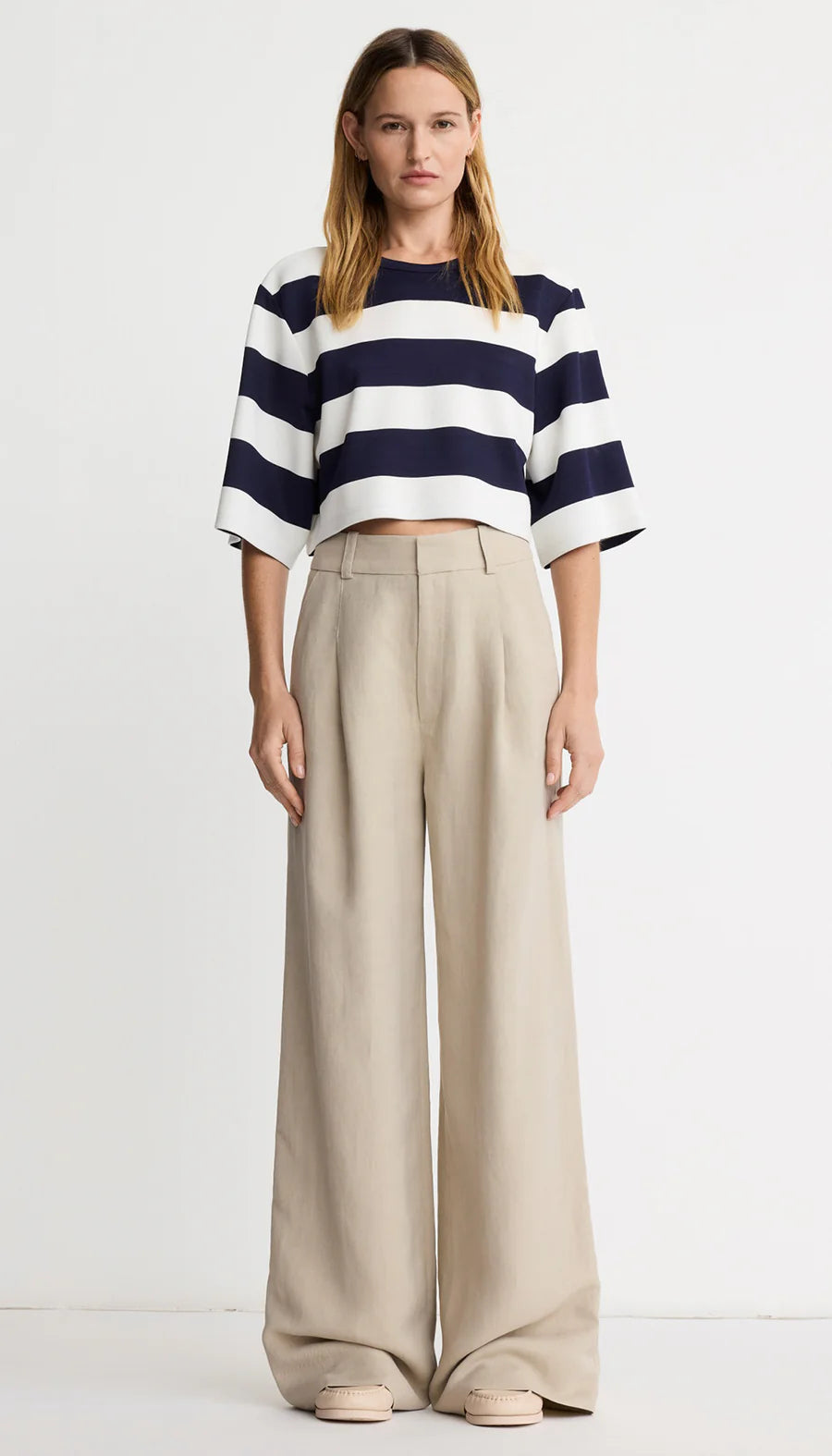 Details: Cropped and boxy, this A-line tee features a dropped armhole and wide sleeve in an awning stripe. This garment fits true to size.