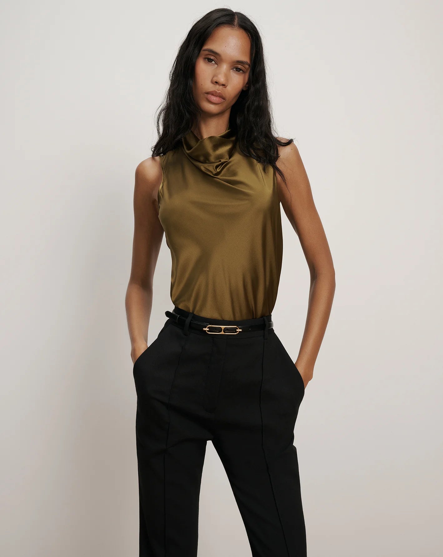 The silk top that does it all. With its slinky drape and elegant cowl neckline, the Tam is cut from luxe maroon stretch silk and finished with a delicate keyhole back. Pair it with high-rise denim for after-hours ease, or go full glam with the coordinating Medina skirt.