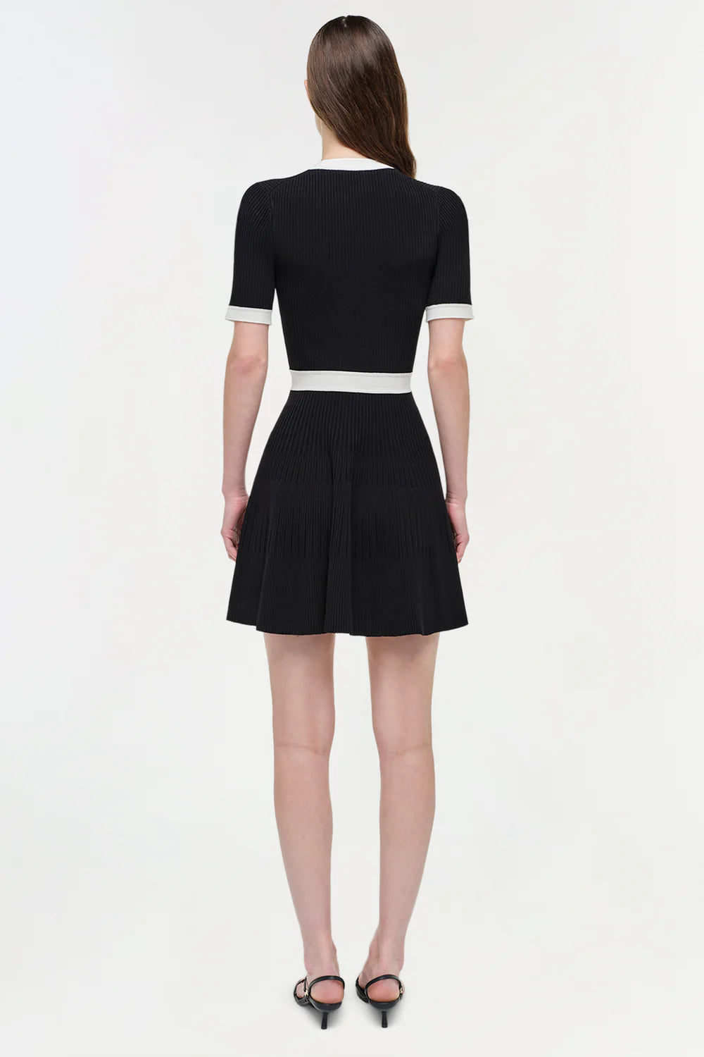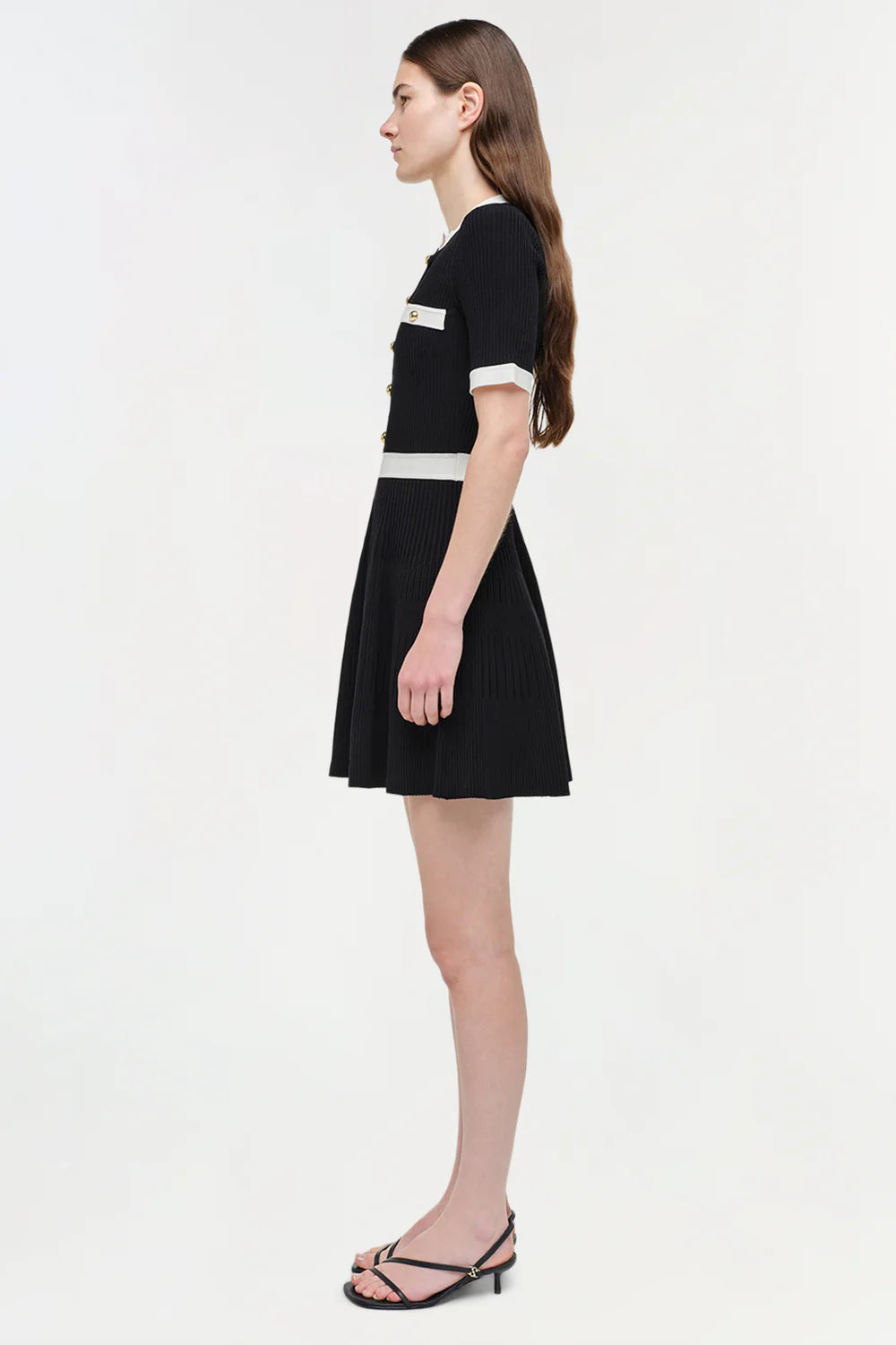 Cut in ribbed knit, this mini dress is framed with ivory trim and adorned with golden buttons down the front. A fitted waist gives way to a softly flared skirt. Classic details create a soft elegance in a dress thats as easy as it is graceful.