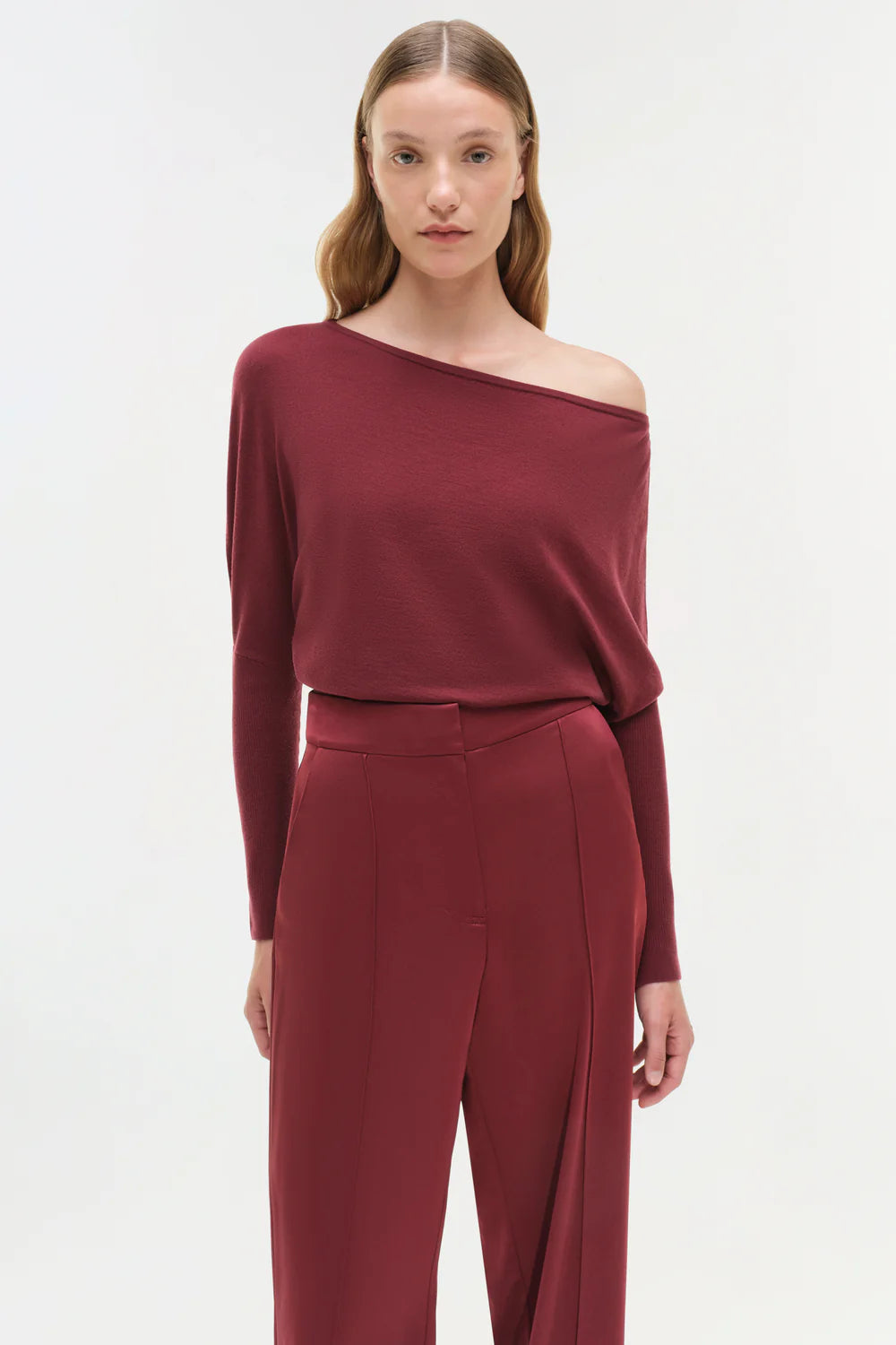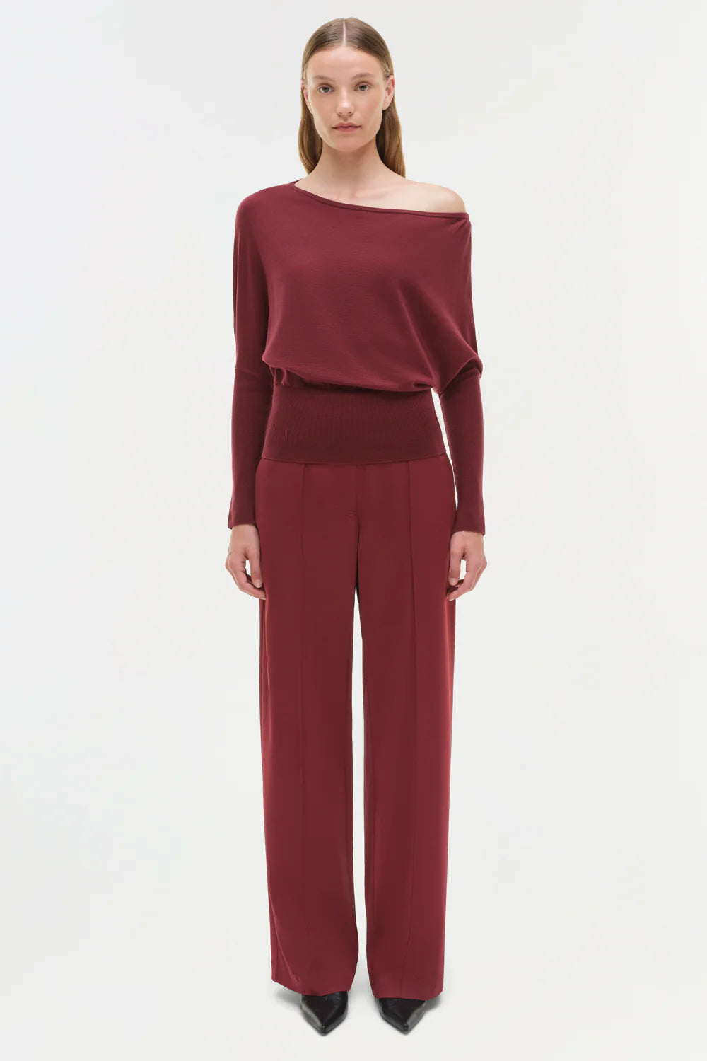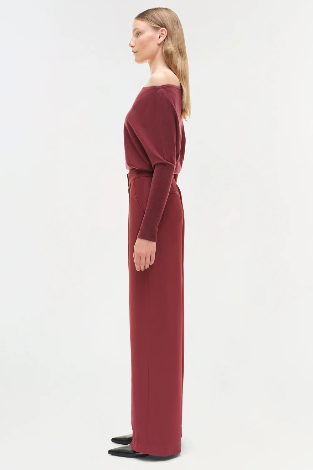 A wide leg woven satin pant with a clean front seam and welt back pockets.