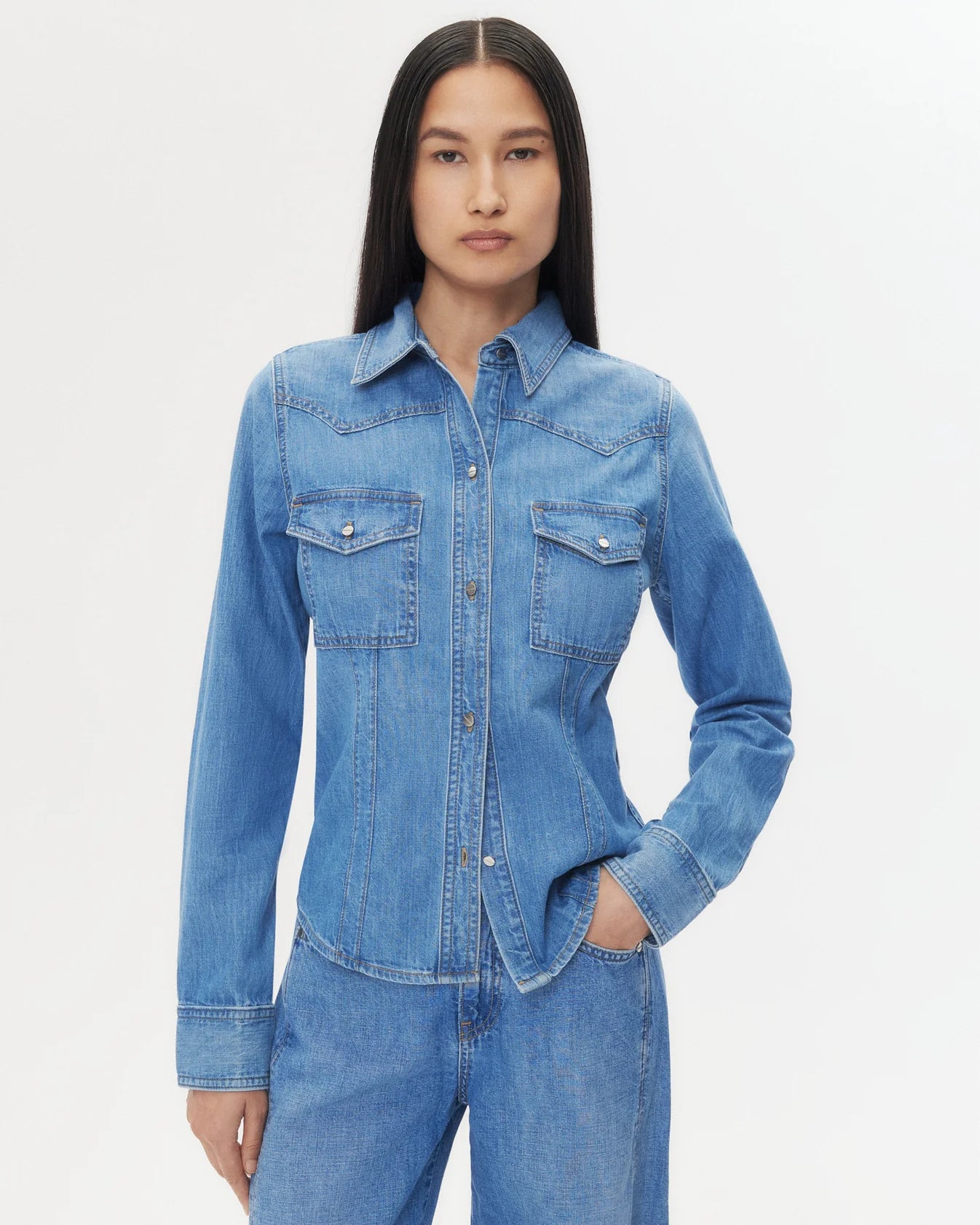 Western button up shirt in cotton denim. This fabric is light and breathable with a textured hand and vintage inspired stone wash. Mustang Sally is a cropped iteration of our western shirting, fitted at the waist. Complete with utility details: chest flap pockets, metal rivet hardware, exposed yoke and contrast stitching at the seams.