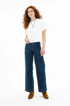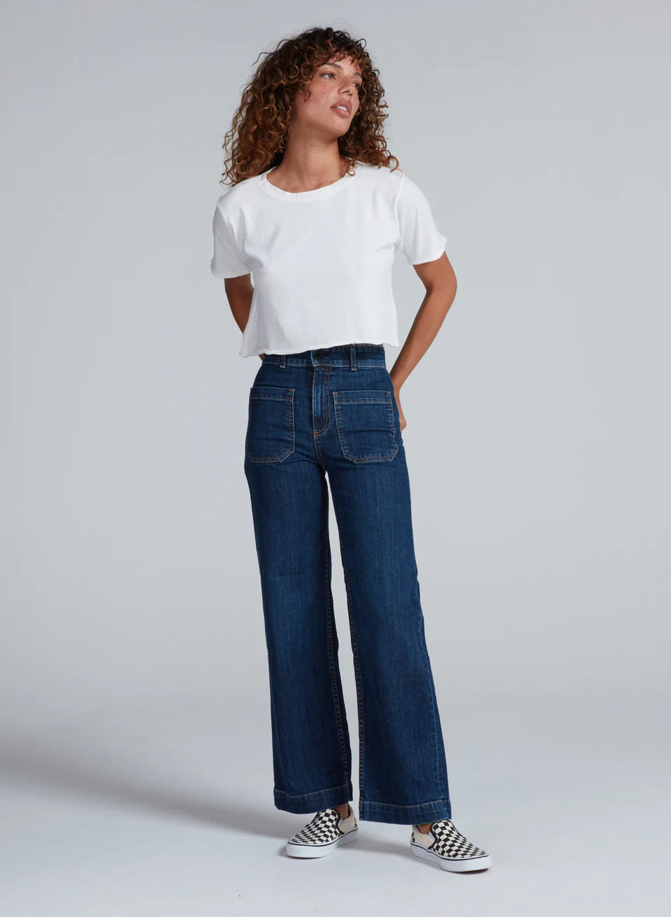 Our classic silhouette featuring a high rise, relaxed wide leg and iconic sailor pocket details. Featuring clean front patch pockets and a structured silhouette, it balances vintage workwear inspiration with everyday versatility. Cut from dark stonewashed Japanese denim with a touch of stretch, this style is effortless, timeless, and easy to wear.
