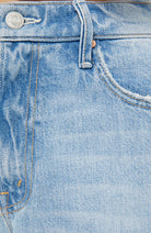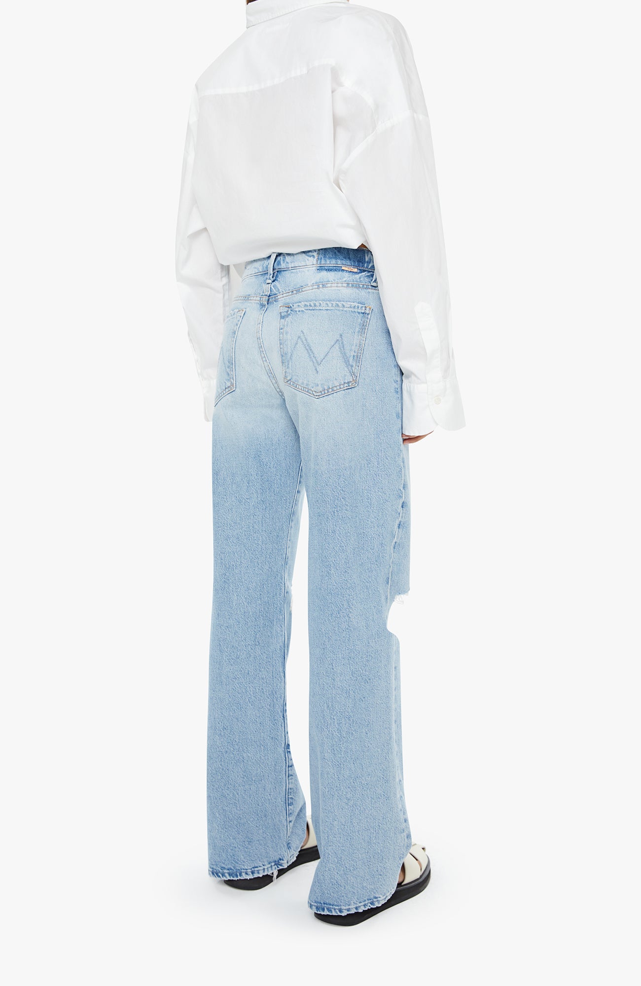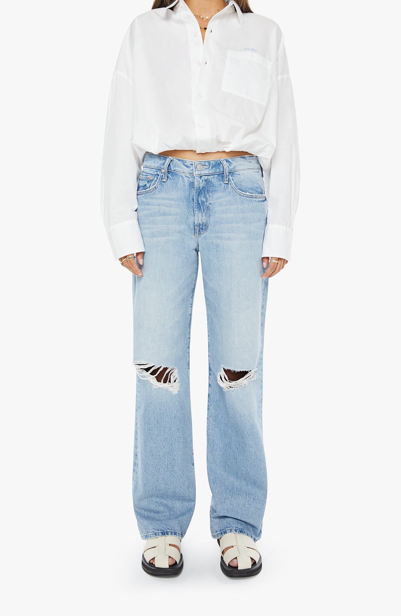 Nice catch. Mid-rise jeans with a loose fit, zip fly, wide leg and 32-inch inseam with a clean hem. Made from rigid SUPERIOR denim, Reelin It In is a light-blue with whiskering, fading and tears at the knees.