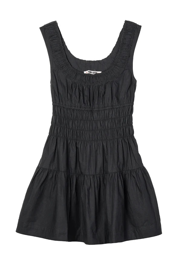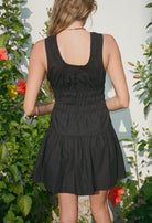 The Kala Dress in Black Cotton is a women’s sleeveless tank-style cotton mini dress in black with a rounded neckline and smocked waist.