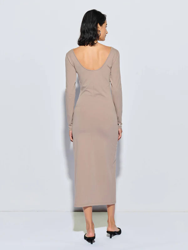 Turning heads has never been this easy. Soft square neckline, curved dart details, tasteful side slit, and a sexy low back. Did we deliver, or did we deliver? (This one comes in Mushroom.)