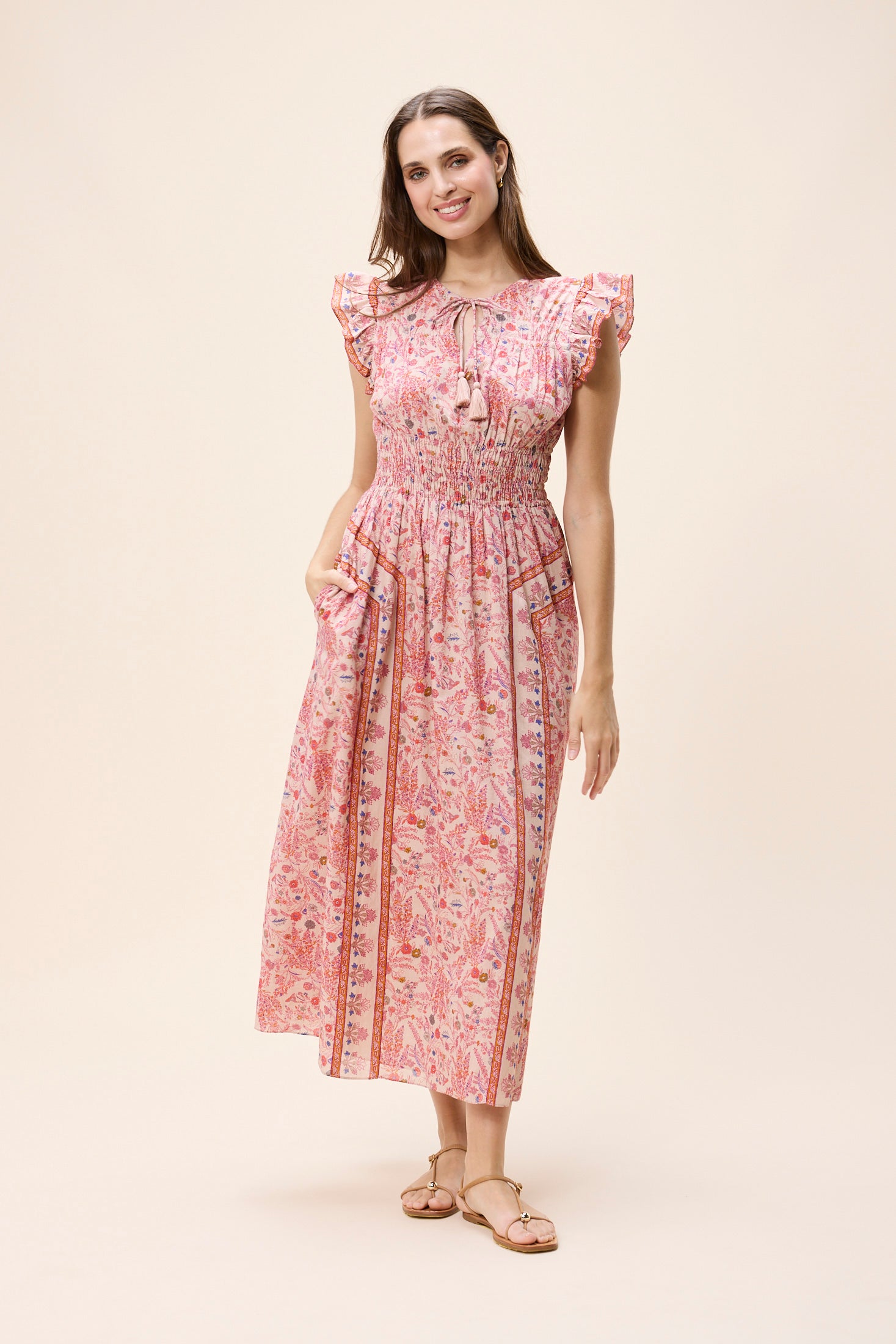 Ethically made in India from GOTS-certified organic cotton mul mul, the Jonni Ankle Dress is designed with a high neckline and fluttering sleeves. The double elastic waist offers comfort and shape, making it an effortless choice for any spring occasion.