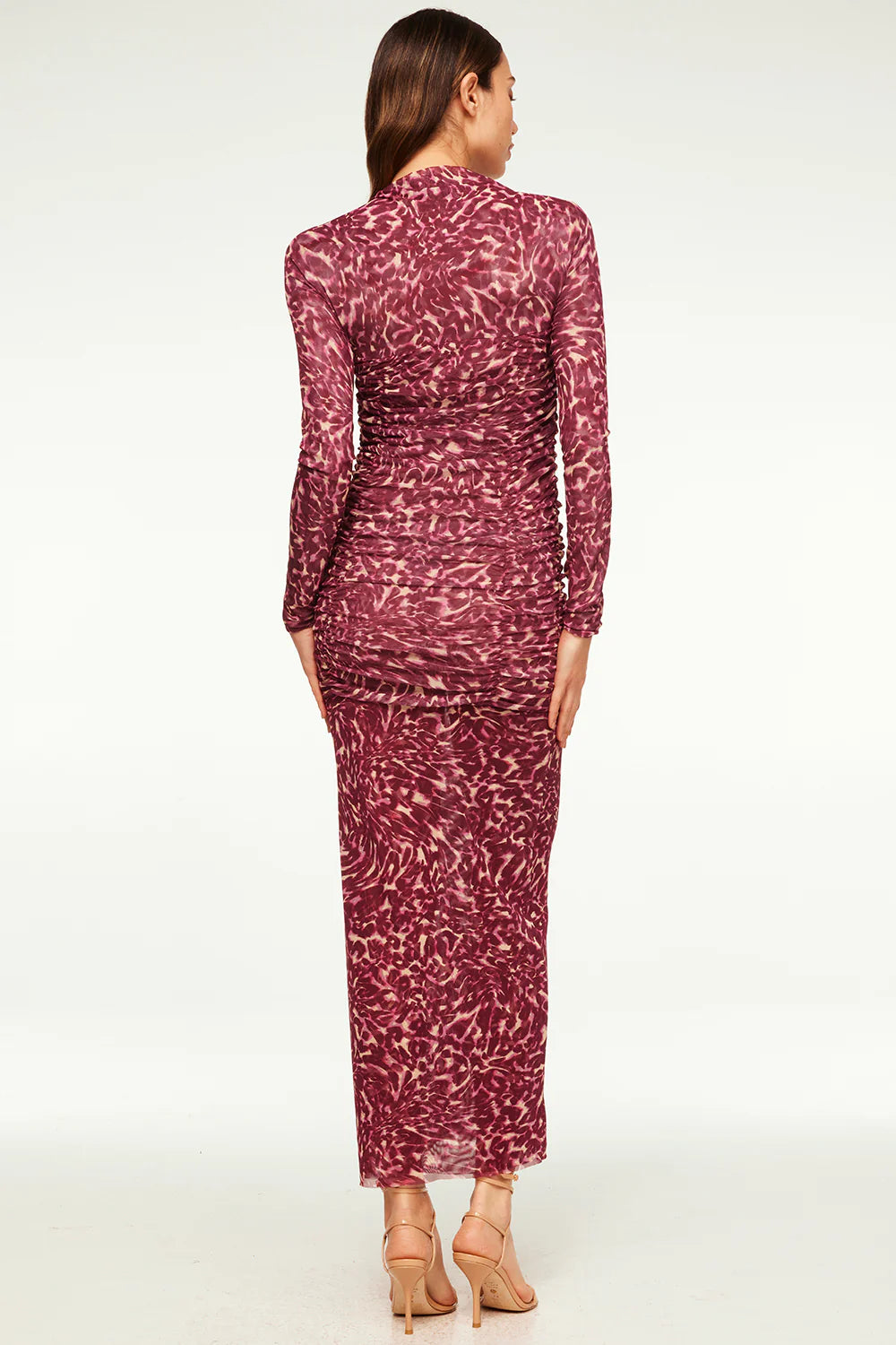 The Ronda dress in leopard fuchsia mesh is the perfect on-trend piece for your fall/holiday wardrobe. Double lined. This maxi silhouette features long fitted sleeves, a square neckline and ruching to hug and accentuate your curves.