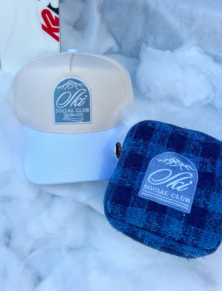 Ski Club! This cute trucker matches perfect with our whole ski collection Great for gifting all your besties who are going on your next group ski trip, bach trip, + more! White vintage adjustable snapback with ski patch