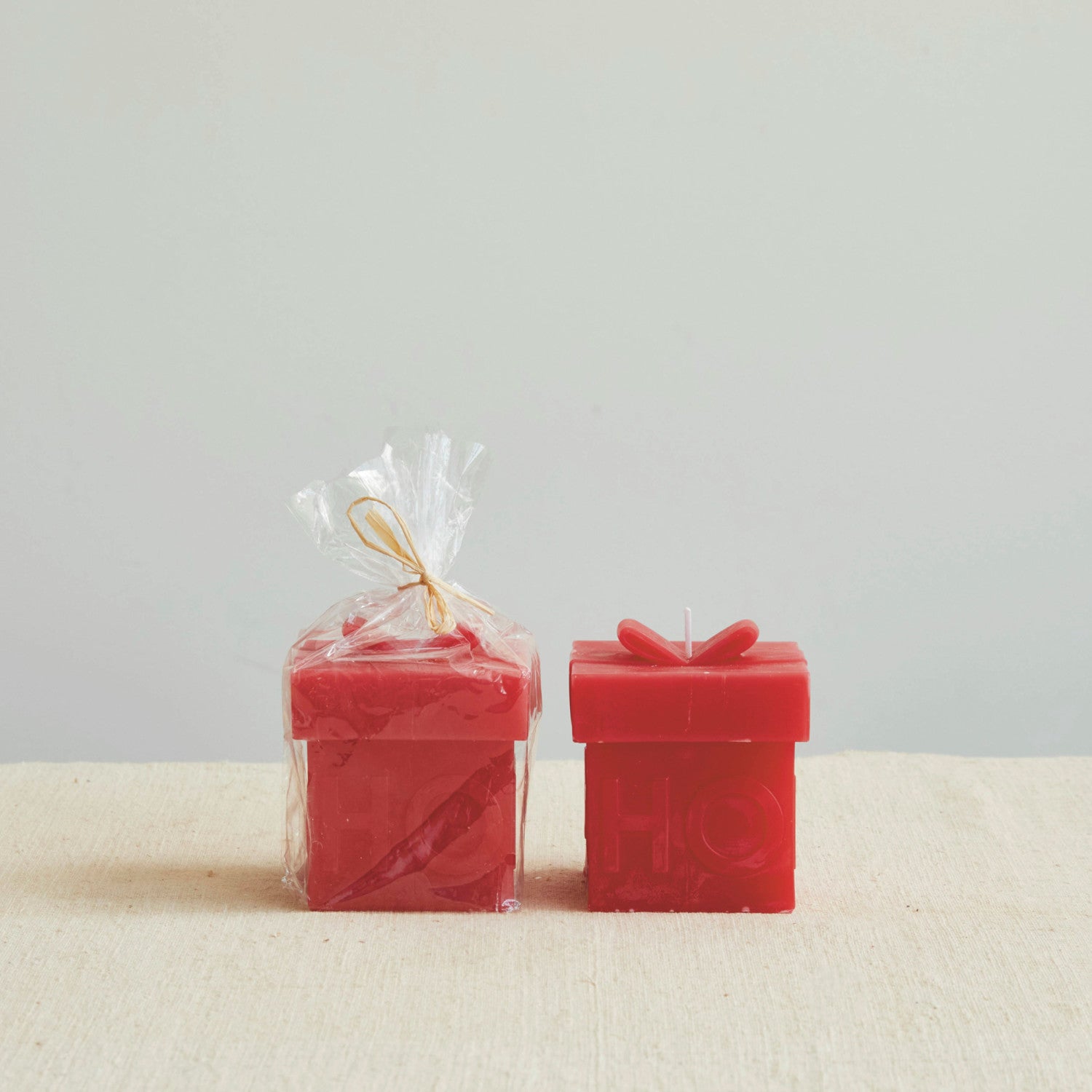 3-1/2" Square x 4"H Unscented Gift Box Shaped Candle "Ho Ho Ho", Red (Approximate Burn Time 50 Hours)