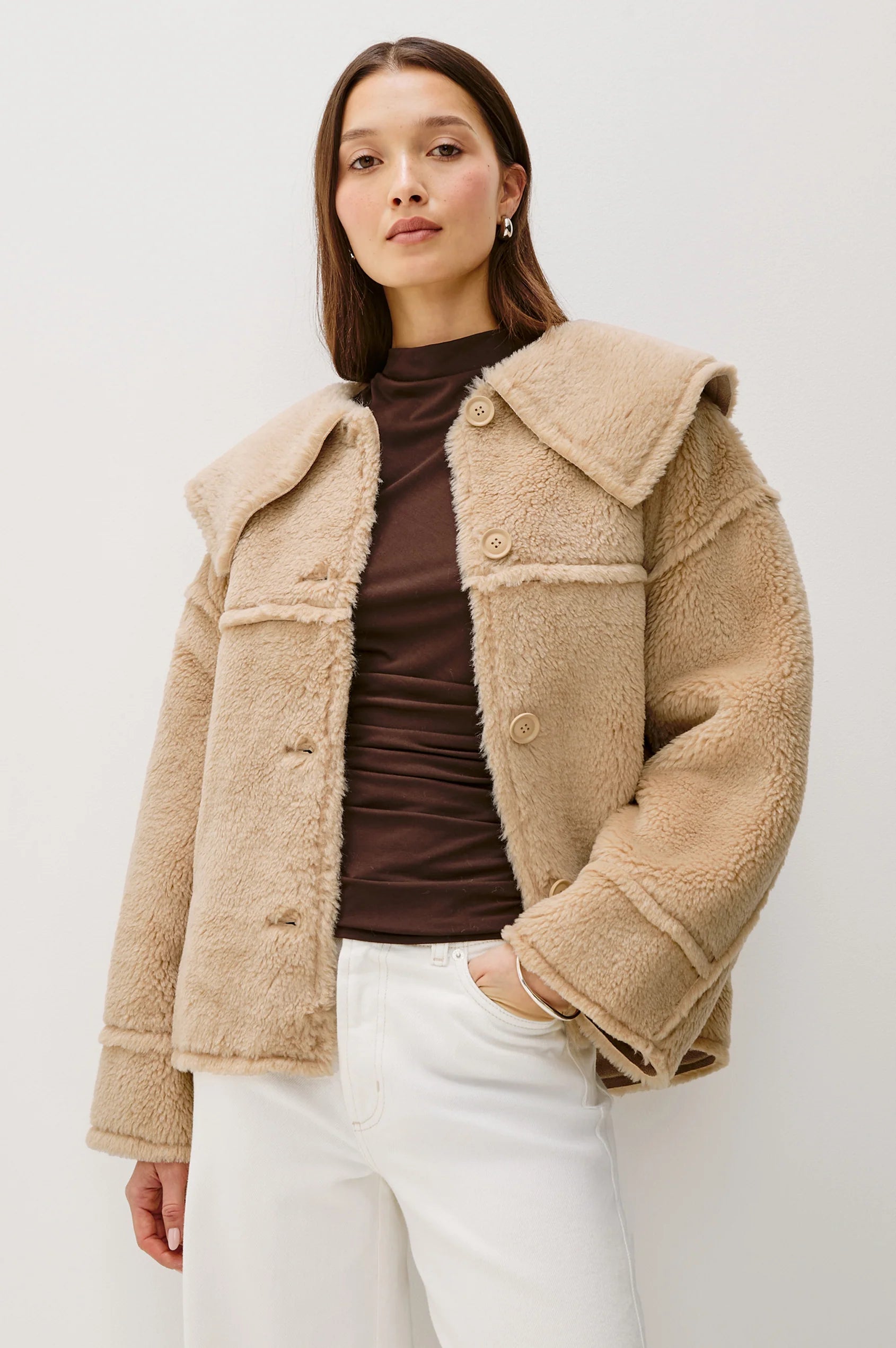 In cozy faux shearling, the Wesson Jacket presents a classic silhouette. It has a cropped, boxy fit and wide shawl collar, finished with button closures and seaming details throughout.