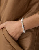 A gorgeously fluid bracelet that boasts a ribbed texture through a unique caterpillar construction. Vintage-inspired foldover closure, finished in high-polish gold or silver.
