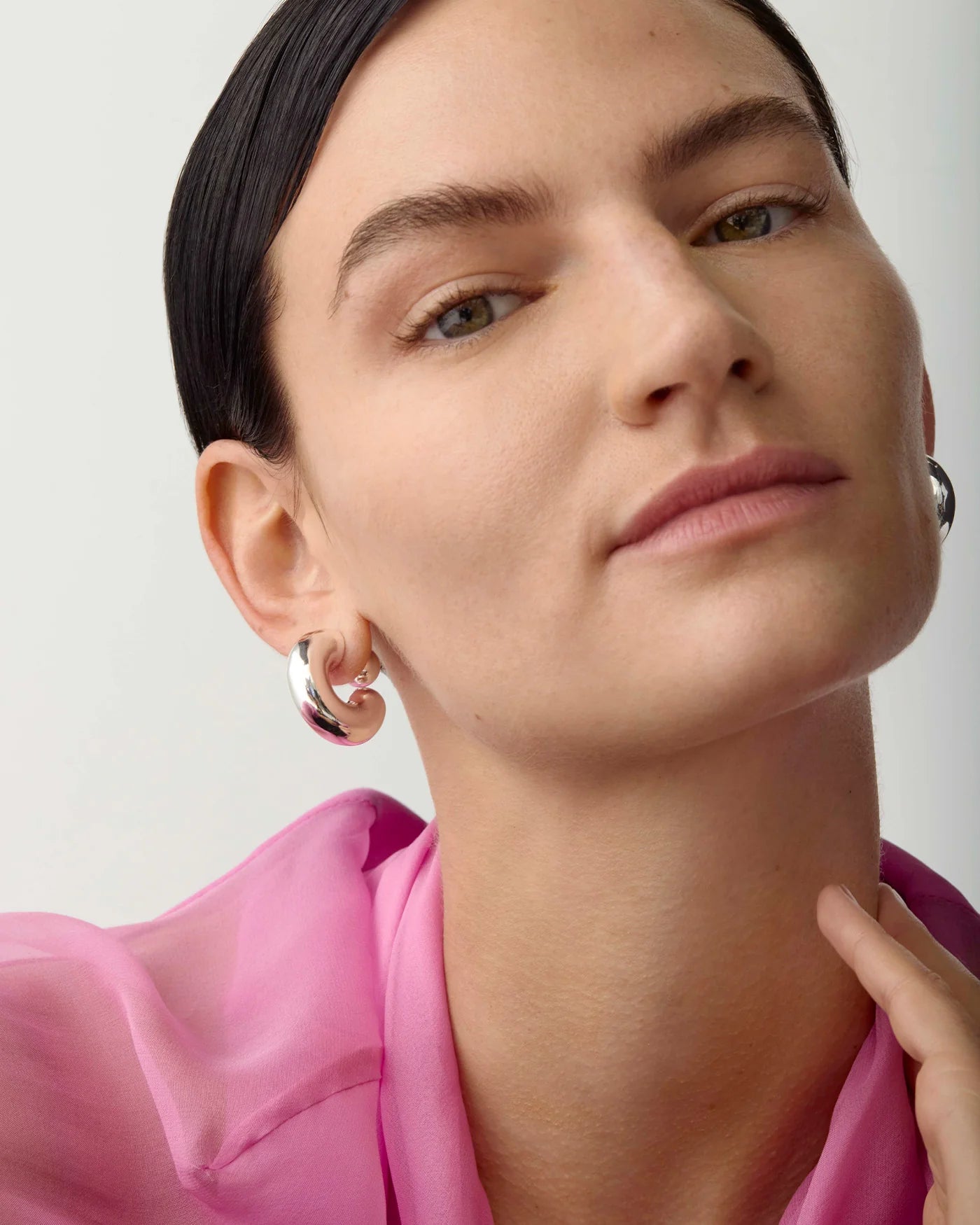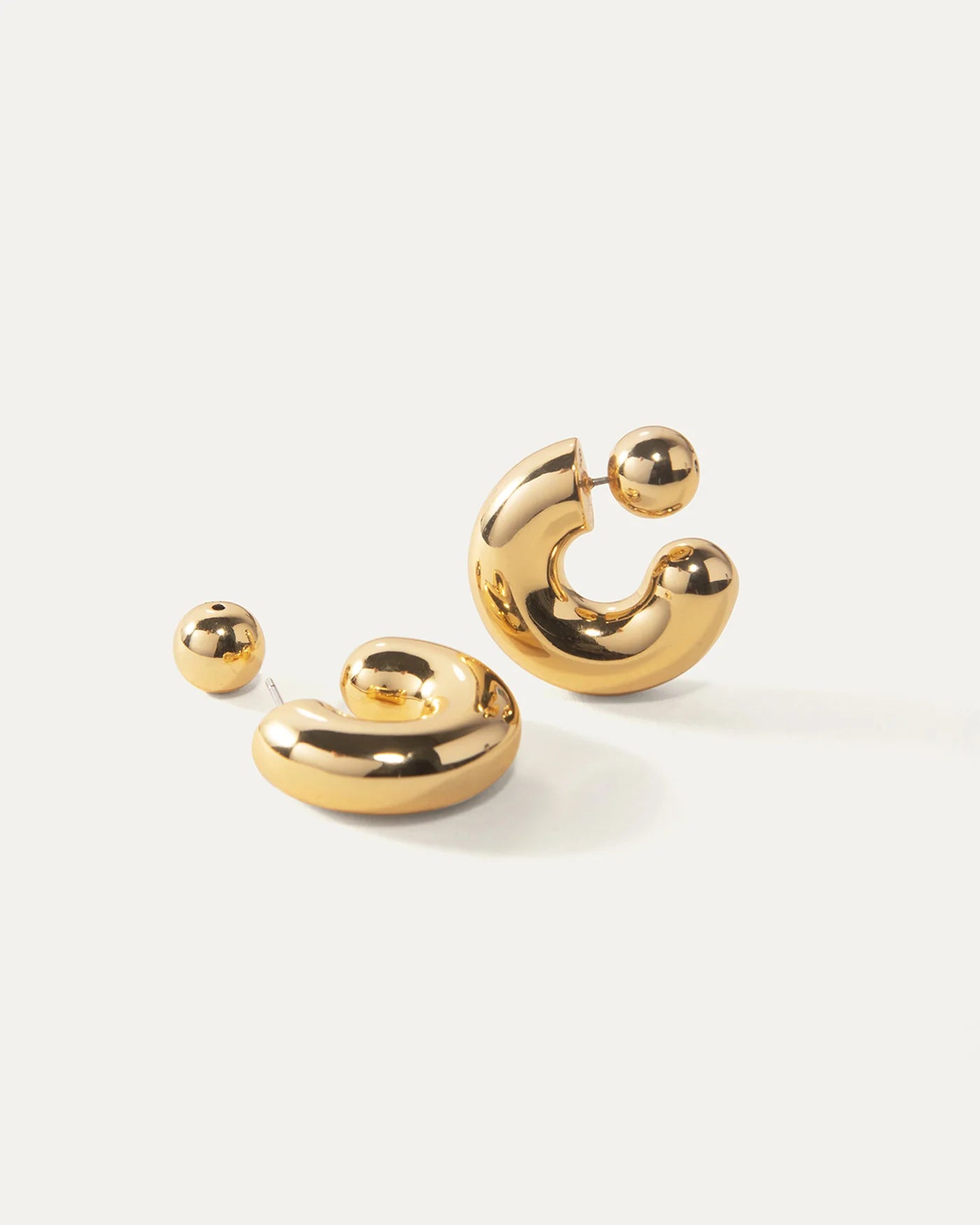 A large, tubular hoop with rounded ends and a custom JB ball backing. Finished in high-polish gold or silver. As seen on Michelle Williams.