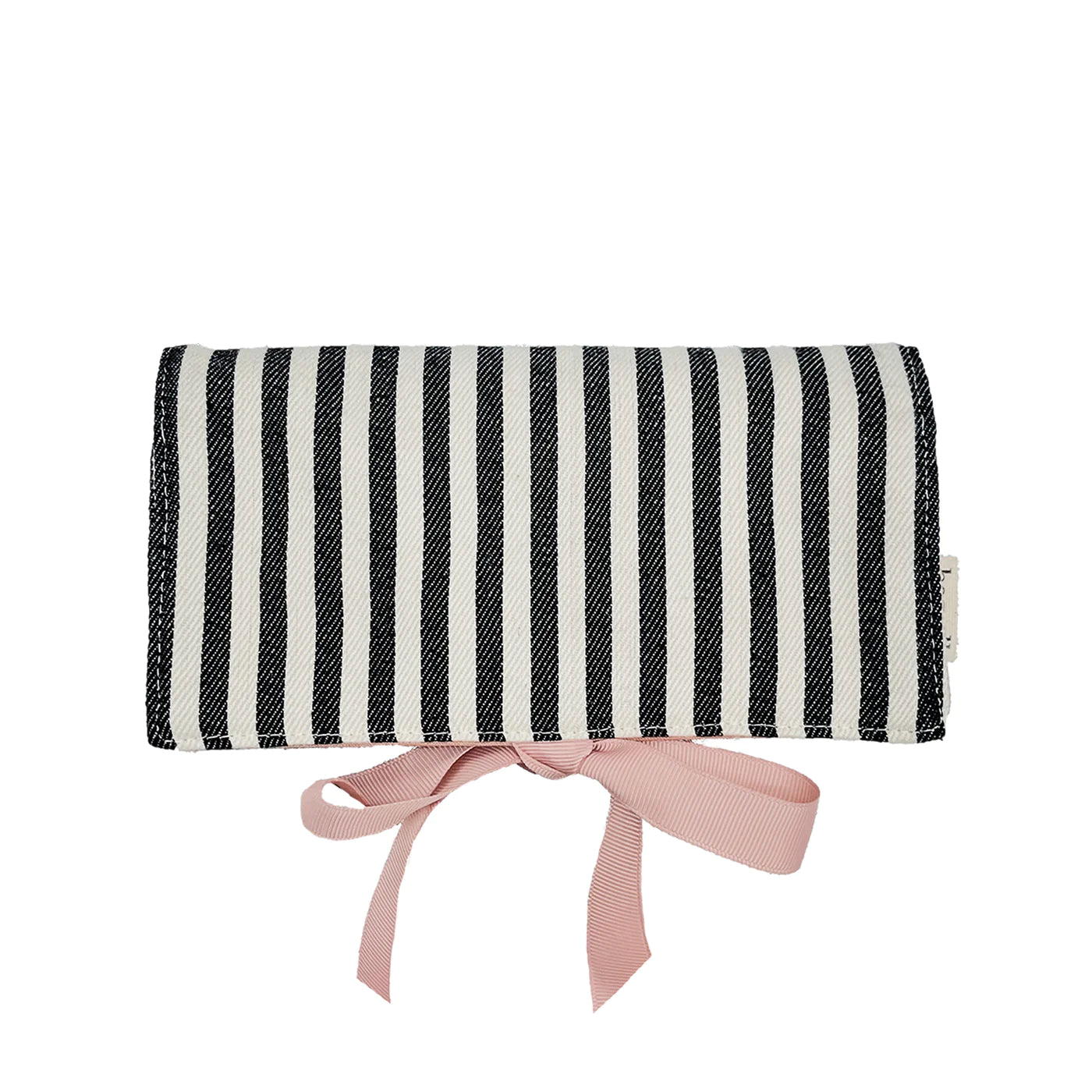 Say goodbye to tangled necklaces and misplaced earrings with our stylish Jewelry Roll Travel Pouch in our signature striped black and white fabric, with cute pink lining. Designed for both travel and home use, this organizer is a must-have for every jewelry lover. With three convenient zipper compartments, you can keep your precious accessories neatly organized and easily accessible. The genuine leather earring holder ensures that your earrings stay secure, while the padded ring holder keeps your rings protected. Plus, this sleek and elegant pouch can be effortlessly rolled up or unfolded, and you can even personalize it with a monogram for that extra special touch. Invest in this functional and elegant solution to keep your jewelry untangled and effortlessly organized, wherever you go.