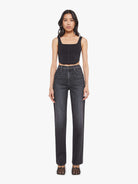 A cut above. High-waisted jeans with a wide straight leg, zip fly and a long 34-inch inseam with a clean hem. Cut from a blend of recycled stretch denim, Keep It Sharp is a washed black with subtle whiskering, fading and tonal hardware.