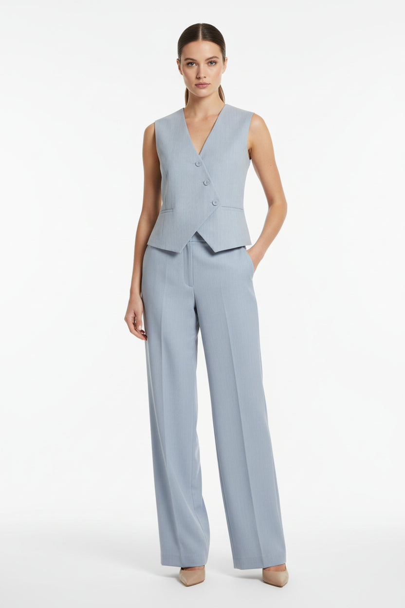 Sleeveless vest in Italian wool twill. The Tyler Vest is designed with a V-neckline and an elongated, tailored silhouette. Features an asymmetric button-front closure that creates a clean, sculpted shape through the body. Finished with welt pockets and a straight hem.