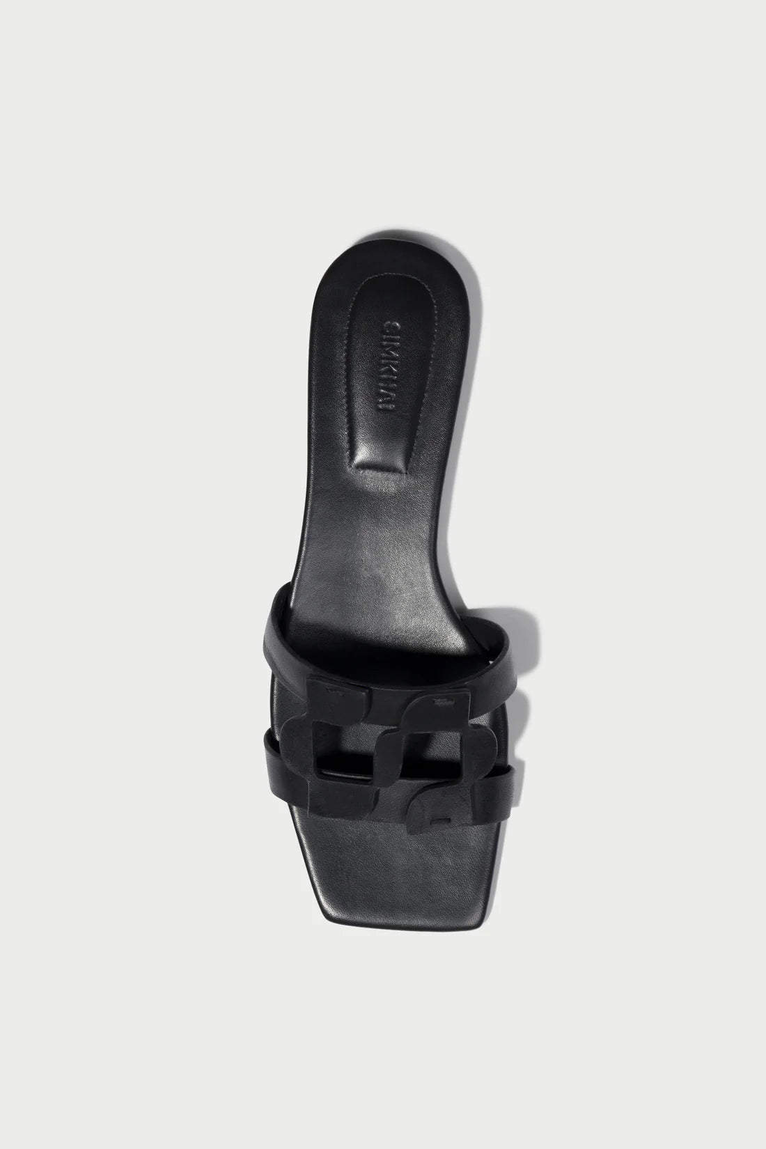 The Simkhai Monogram Slide in Black. Featuring a sleek design and iconic detailing, these flats are perfect for elevating your casual wardrobe.