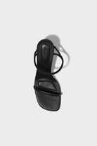 The Siren Low Heel Sandal in Black. Featuring minimalist straps and a sculptural heel for a modern edge, this 65mm heel is a wardrobe staple, perfect for an elevated everyday look.