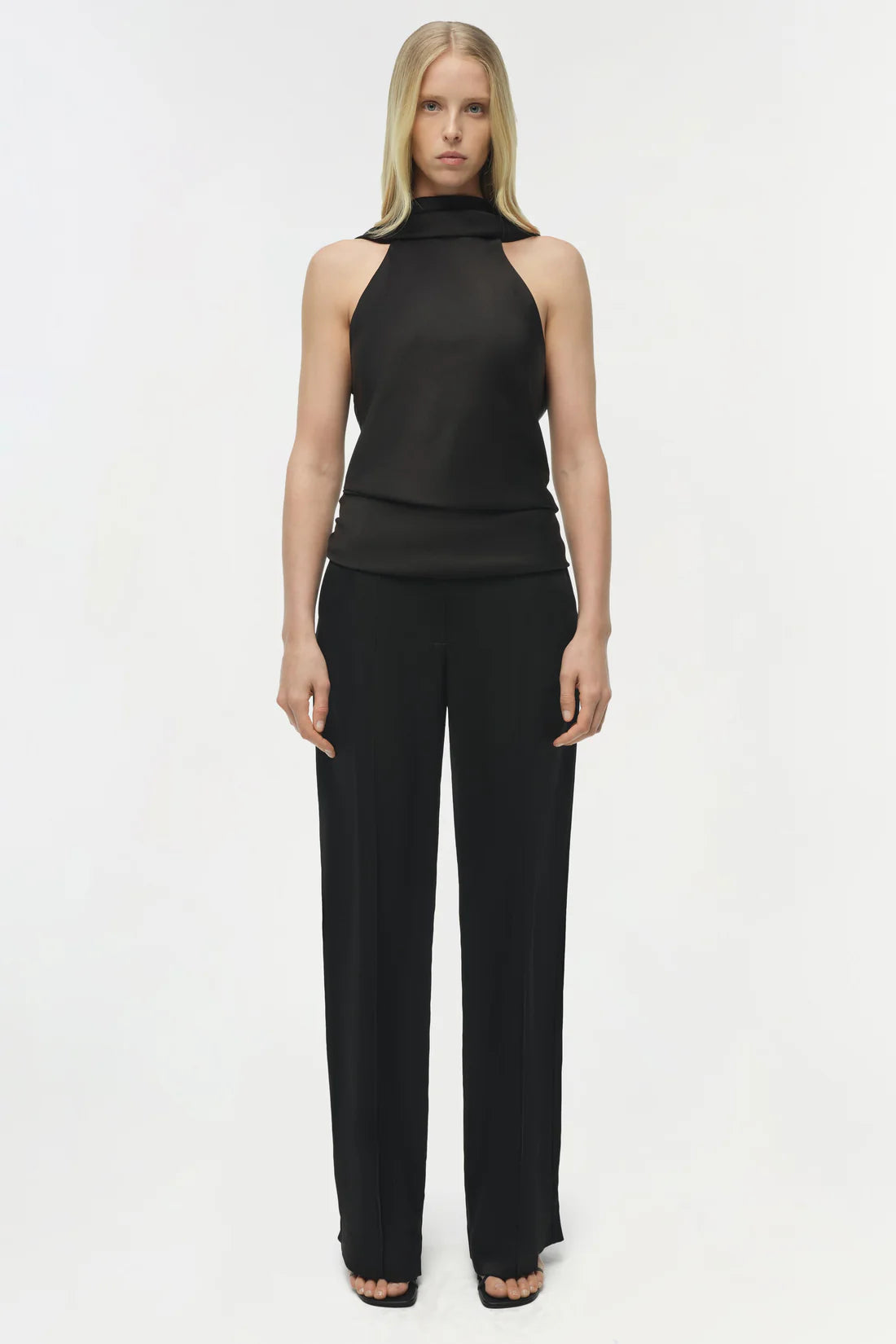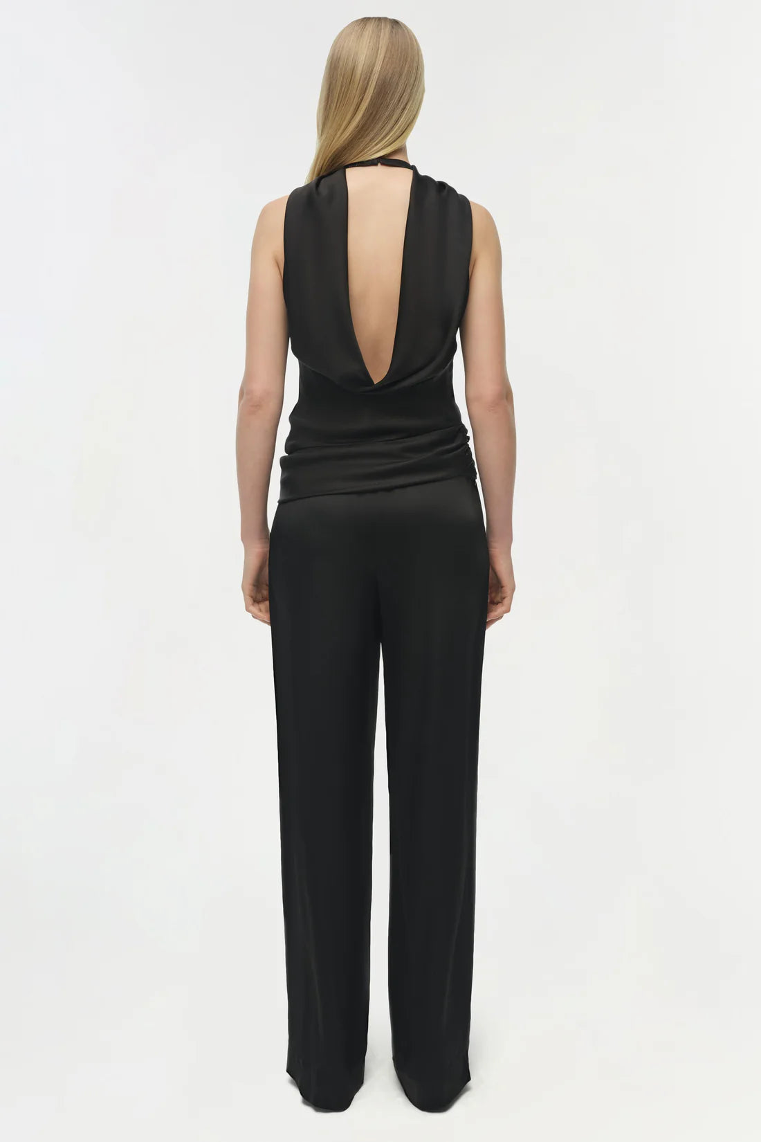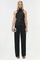 The Samira Satin Cape Top in Black. This woven satin top features a halter-inspired cape design. Gathered detailing at the waist and hem creates fluid movement, balancing a sculpted silhouette with effortless sophistication.