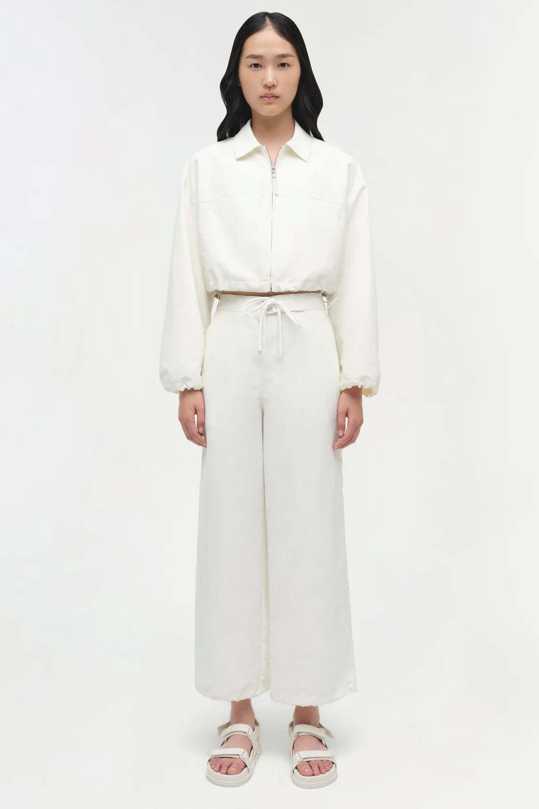 The Colsen Cropped Jacket in White. Cut from a crisp cotton, this cropped jacket has a boxy, relaxed silhouette, defined by tonal seams and gentle volume through the hem for a flattering, structured look.