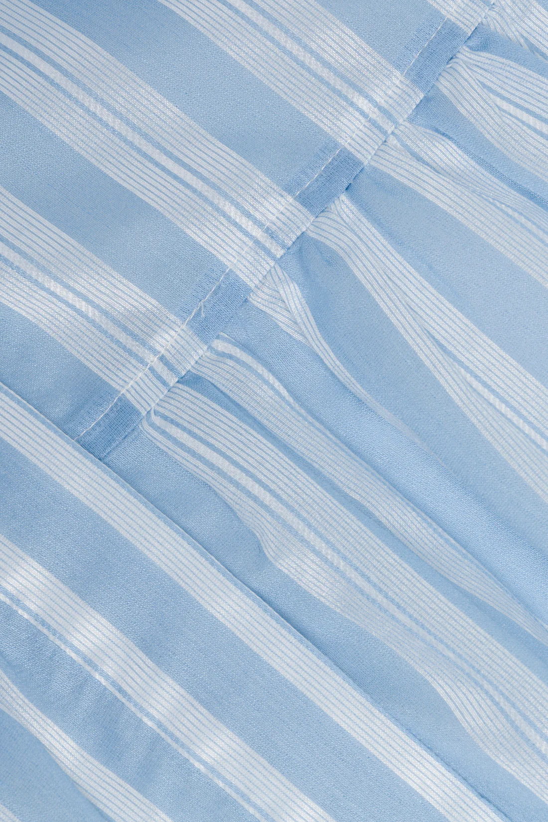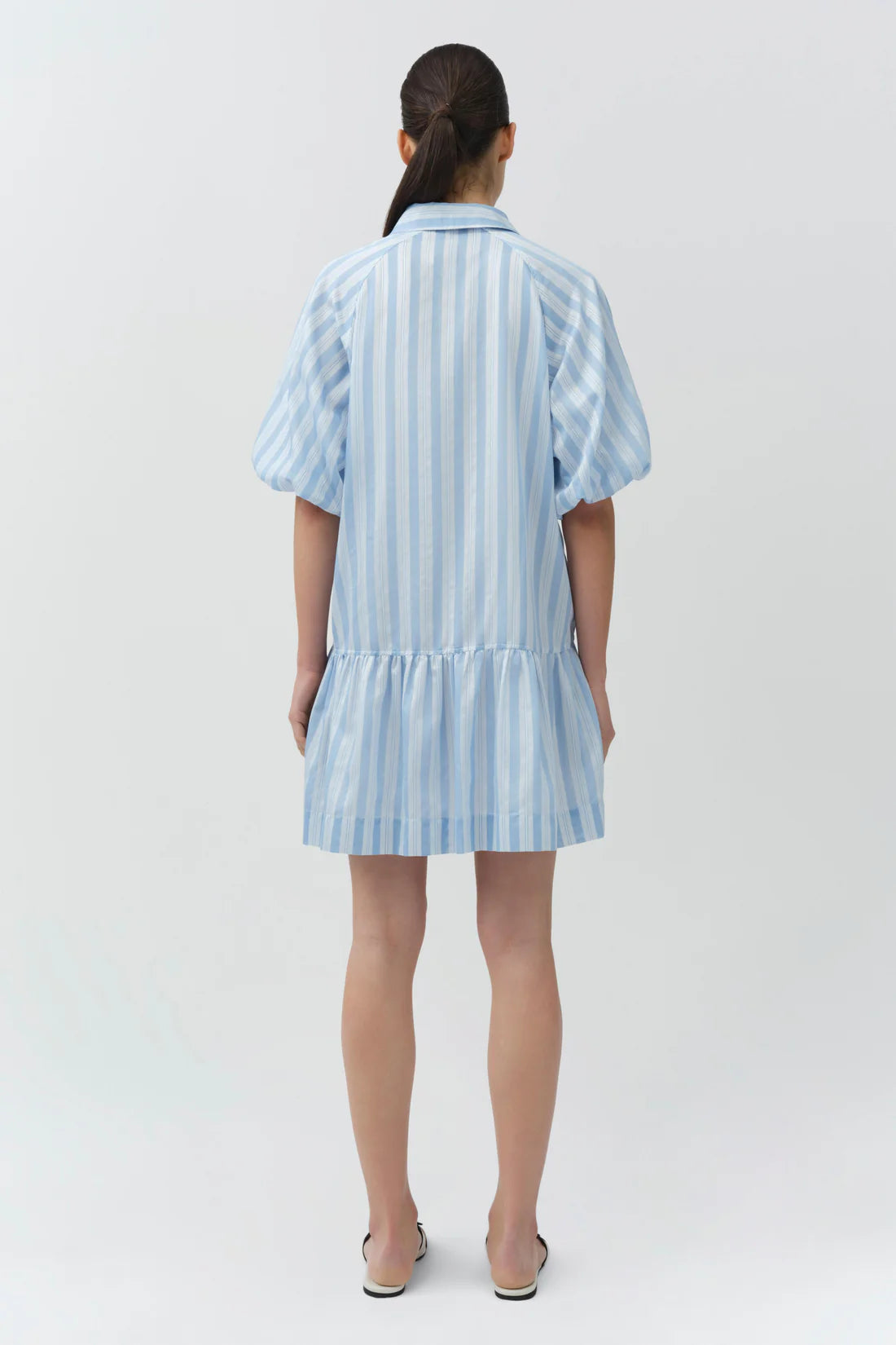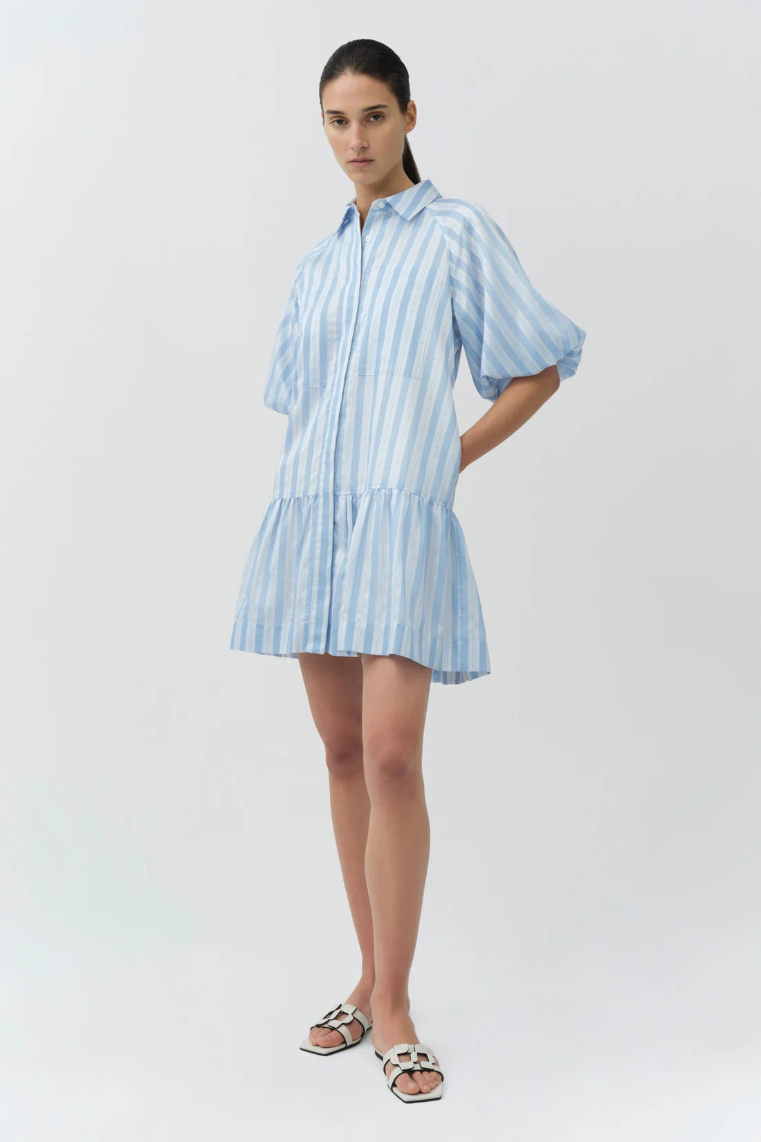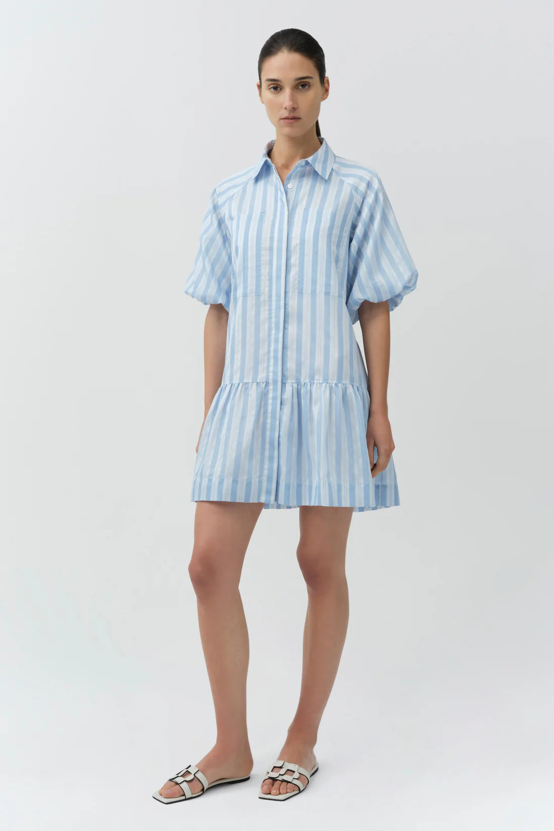 The Crissy Mini Dress in Oxford Blue Multi. Crafted in a yarn-dyed satin stripe, our most loved mini shirtdress features a classic color, softly shaped sleeves, and a dropped waist. The relaxed silhouette is finished with a subtly gathered hem.