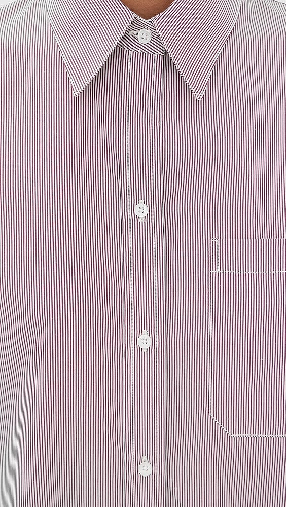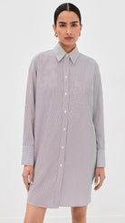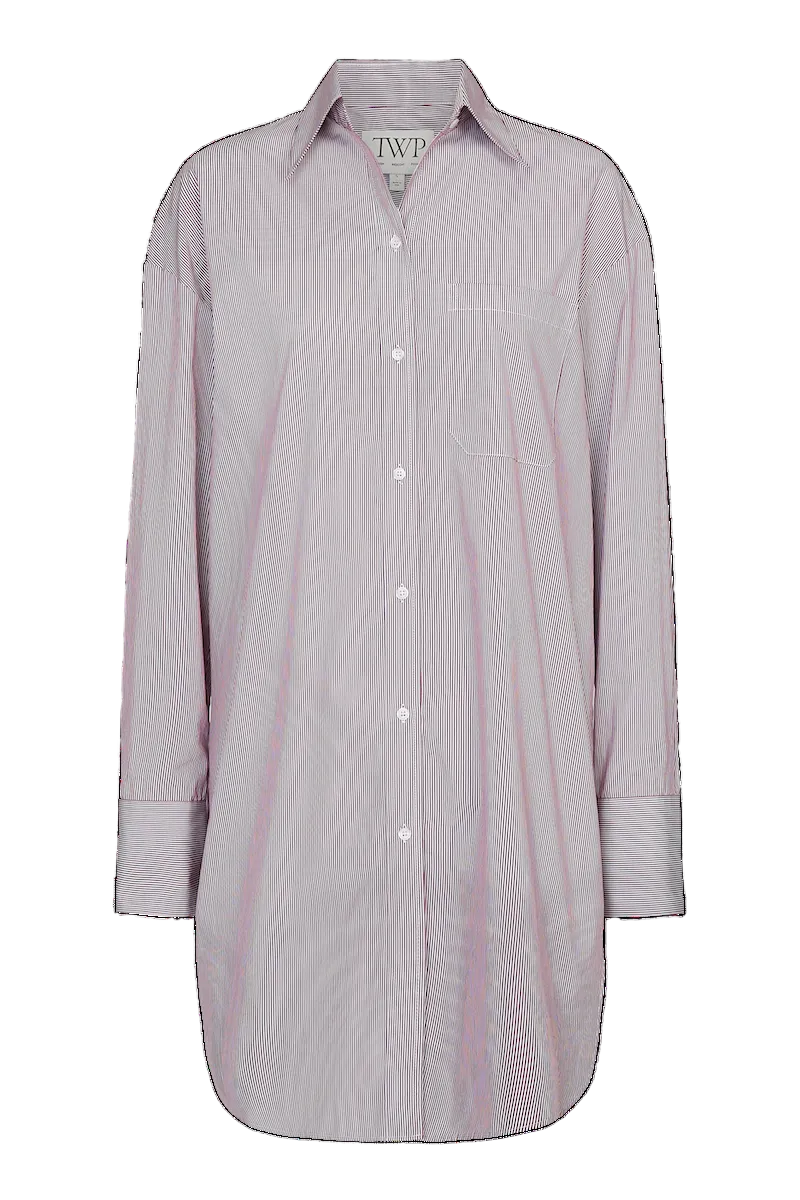 Oversized Shirt dress shirt in mixed hairline cotton stripe. Fabric is a lightweight poplin with bold and narrow stripes woven together. The Big Joe dress is a menswear-inspired, relaxed button-down. Complete with a chest patch pocket, button placket, French cuffs, and a tulip hem.
