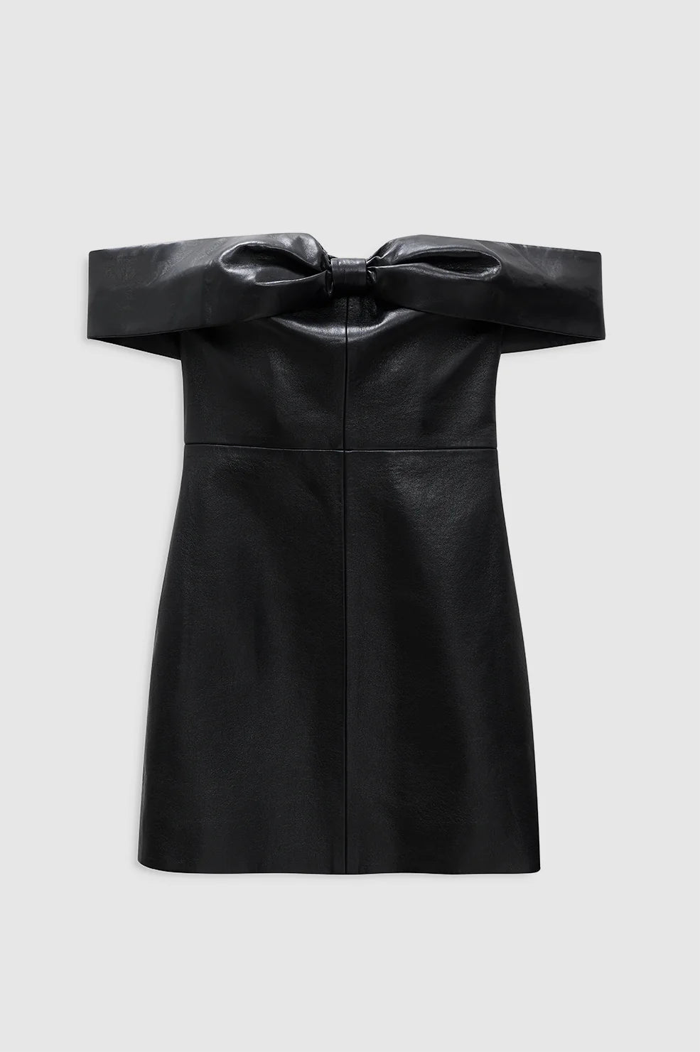 The Colleen Mini Dress is an off-the-shoulder staple—a recycled leather dress finished with a bow in the front.