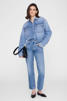 A vintage workwear-inspired shirt constructed from midweight, rigid cotton denim in a faded cast indigo wash.