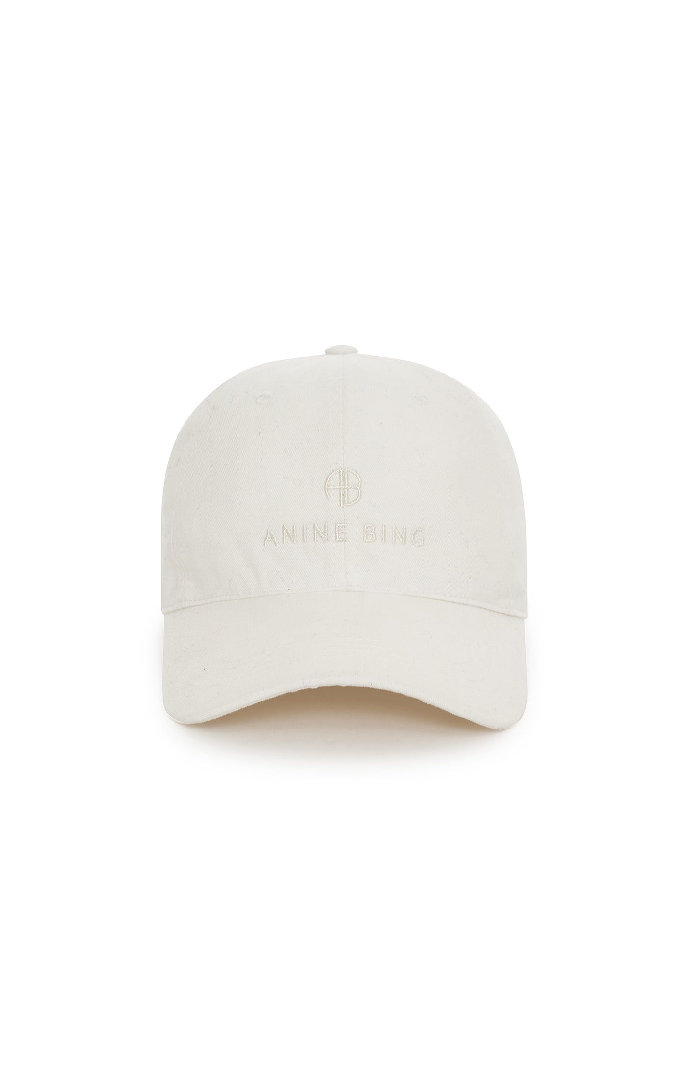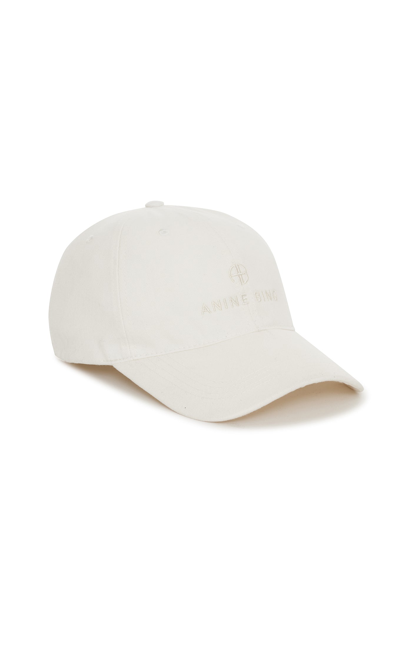 An everyday cotton denim hat in ivory canvas with contrast stitching and embroidered ANINE BING logo at front. - Cotton - One size - Adjustable back strap - White embroidered logo