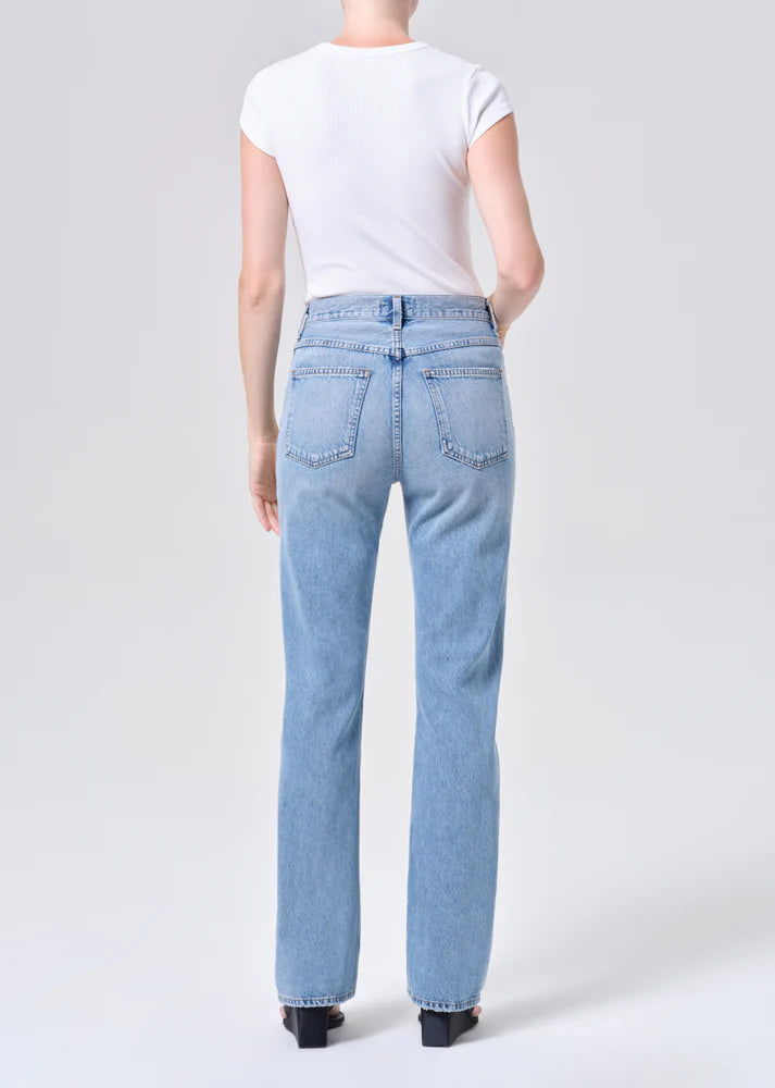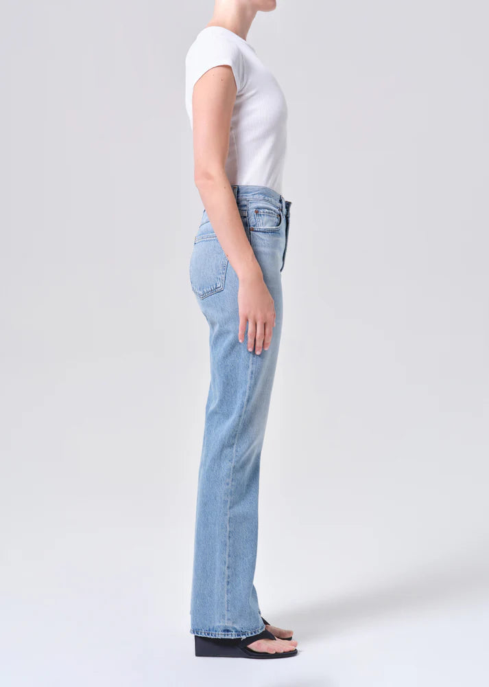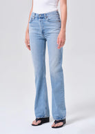 Designed to elongate and flatter, the Leena Jean features a high rise and full-length flare that hugs through the hip before subtly kicking out for a sculpted, feminine shape. Rendered in a light vintage washed-out indigo, it embodies a relaxed yet refined look. Crafted from non stretch, weightless denim washed down for a super soft feel, it drapes beautifully while maintaining structure and ease. Pair it with a minimal tank and sandals for effortless polish, or style with a tonal denim shirt for a clean, head-to-toe look.