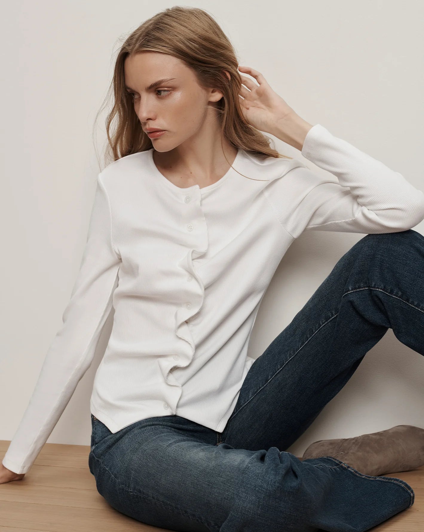 The classic long-sleeve tee—with a feminine twist. Crafted from white stretch cotton, the Jasminah top features a button-front silhouette that’s intentionally ruched to create an accordion-like effect, adding texture and depth. Long sleeves and a split hem complete the design. Perfect for elevating any day look—style this crewneck top with VB denim for off-duty polish or with wide-leg trousers for the office.