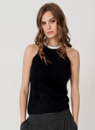 Cashmere mockneck halter sweater tank with rhinestone necklace detail