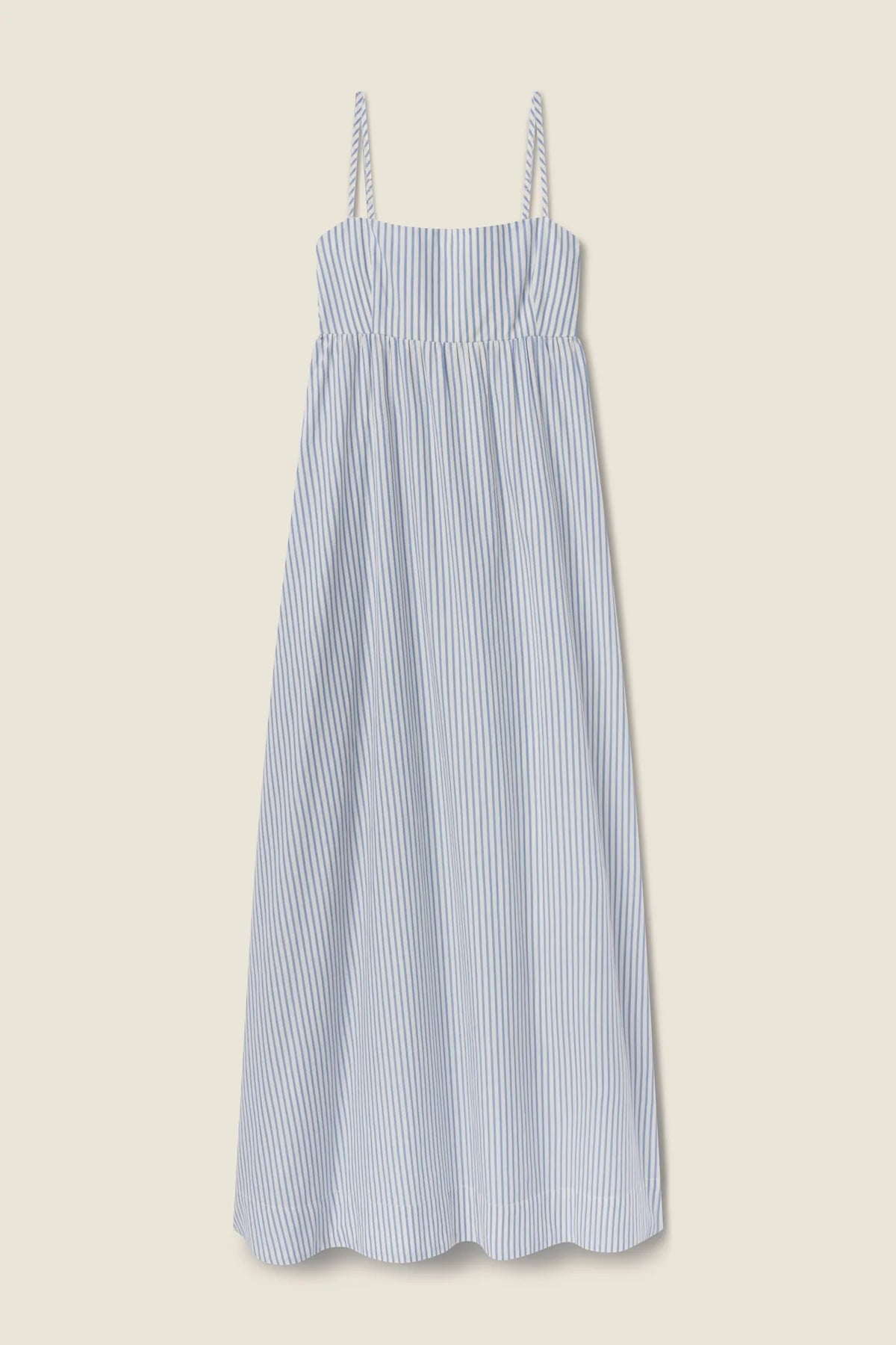 The Mirela Dress is our newest full-length dress. Its ‘barely there’ straps contrast with the dramatic fullness of the skirt, featuring hidden side seam pockets. The adjustable straps have vintage metal rings and adjusters that allow for a custom fit. Shown here in Seaside Stripe and made from our coastal cotton twill.