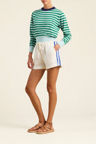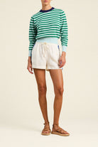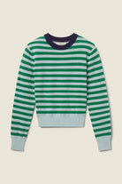 The Cleo Sweater is our classic knit sweater. Complete with alternating yarn-knit stripes and contrasting ribbed cuff and bottom hem. Shown here in Green Stripe and made from our soft cotton.