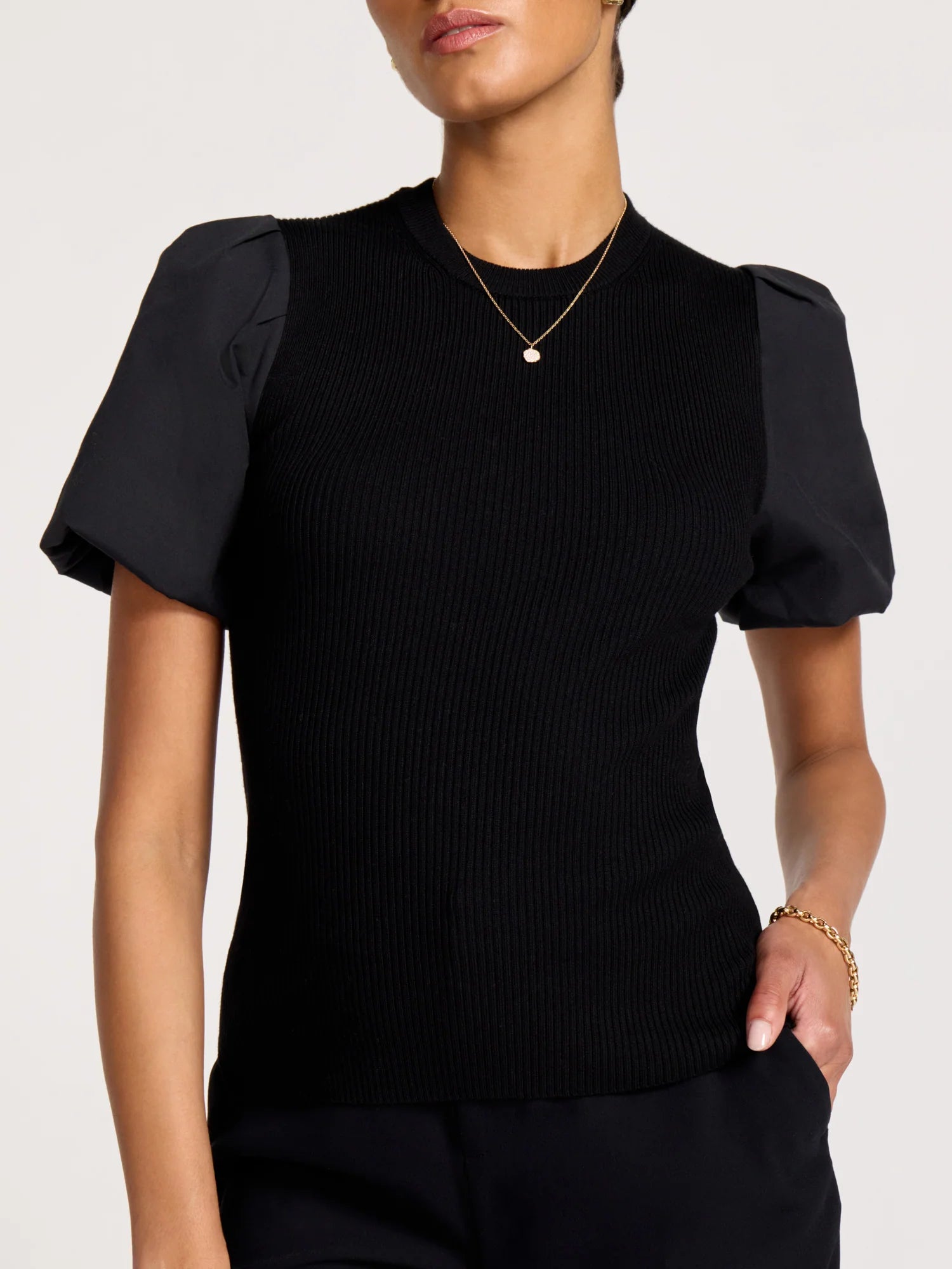 Mixed media mastery. The Morgan Top contrasts a ribbed, slim body with woven statement sleeves, bringing depth and polish to a wardrobe essential.