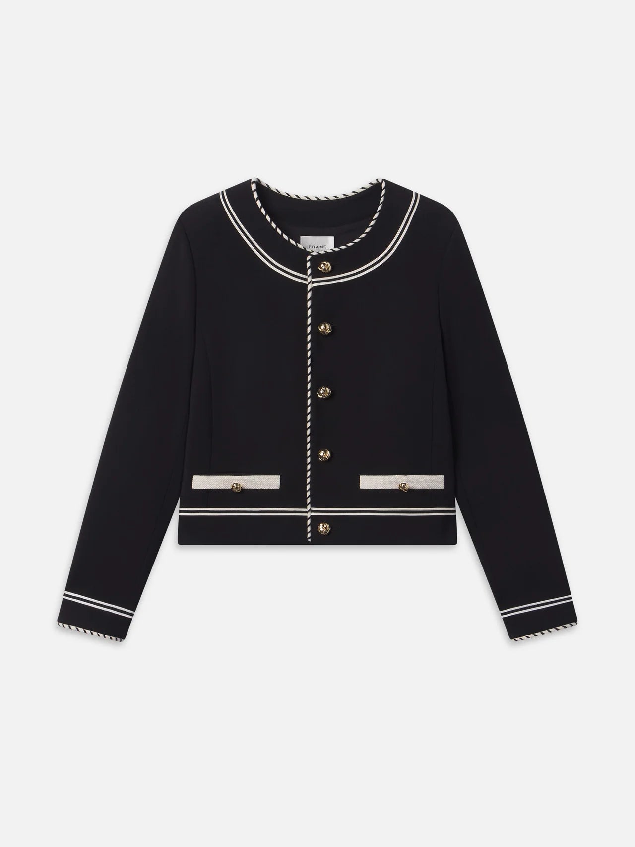 The Prim Jacket is crafted with contrast piping, novelty gold knot buttons, and functional front pockets, featuring a clean, cropped silhouette that pairs effortlessly with mid-rise denim or the matching Prim Slim Palazzo for a full look.