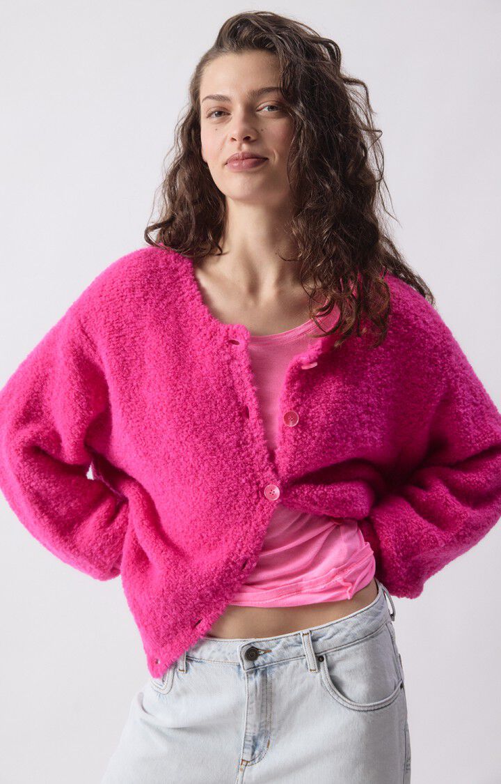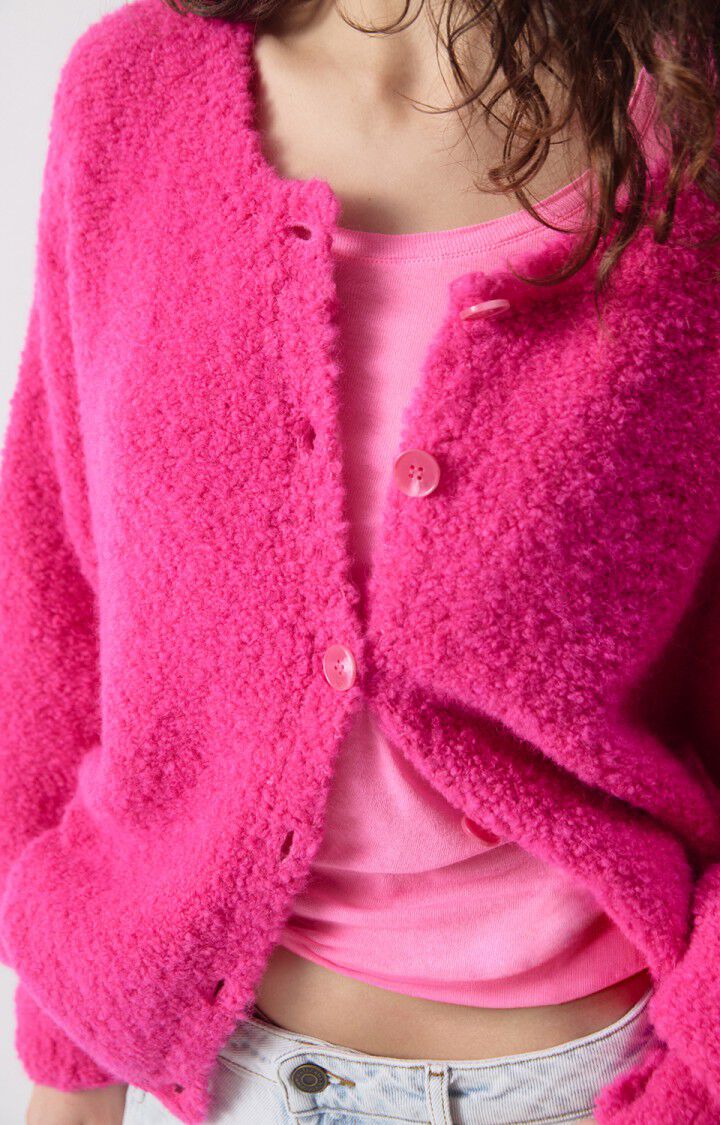 The Zolly cardigan for women is appealing with its short cut and loose fit. Knitted in a dense, soft bouclé knit, it offers a warm feel and a rich textured finish. Its round neck subtly highlights the shoulder line, while its long sleeves and front button fastening reinforce its cosy, feminine look. Thick and enveloping, this premium jumper stands out for its Italian yarn and pronounced texture, creating an authentic piece with a bold style. Wear it slightly open over a shirt for an elegant and warm look.