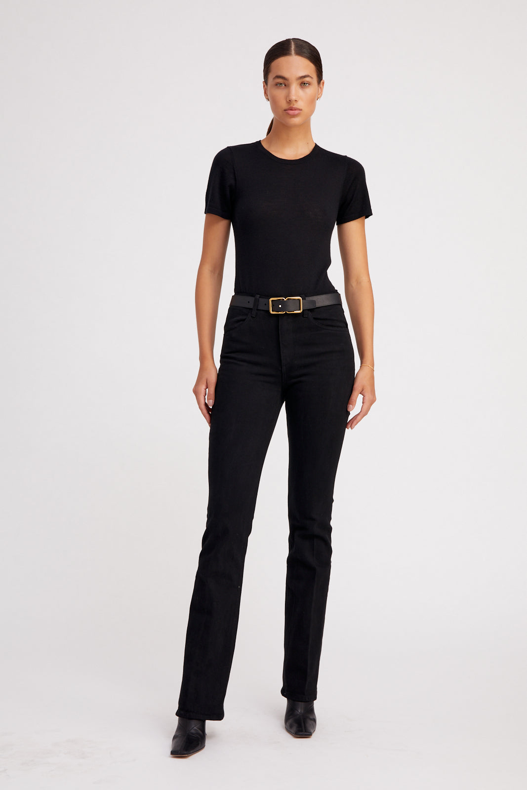 A timeless and versatile silhouette, our signature Micro Flare jeans host a high rise with a slim fit, and a narrow flare that extends past the ankle to elongate the leg and flatter all the right places. Featuring our signature back V and chic faux-croc embossed label, these pants will quickly become your favorite pair of jeans. Wear them with a blouse and heels for an elevated look, or throw them on with a tee and some sneakers for a more classic vibe.