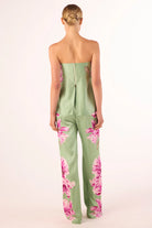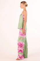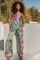 Izzie is a wide-leg pant cut from a soft sage green satin with a large-scale tonal pink floral motif down the sides of the legs. Designed in a pull-on style with a flat front waistband and elasticated back for comfort, it features side slit pockets for a relaxed yet refined finish. For a statement look, pair with the coordinating Yassi top.