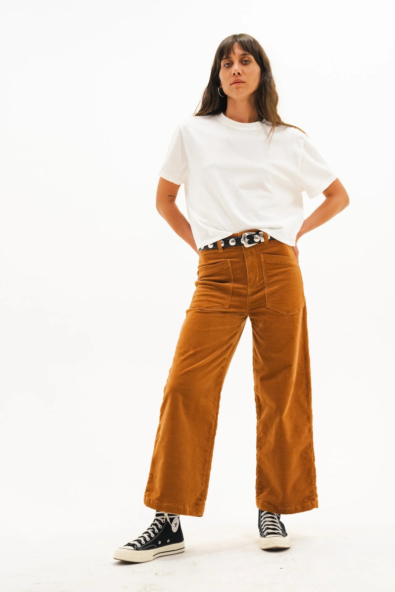 A modern wide-leg corduroy pant with a high rise and a structured yet comfortable fit. Designed with stretch for ease of movement, the Virginia Pant features clean front seaming and a vintage-inspired silhouette that hits just above the ankle. Finished with tonal stitching and a raw hem for a casual edge, it's the ideal statement bottom to pair with your favorite tee or knit.