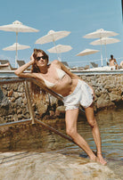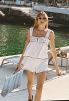 The Joska Short in White is a women’s mid-rise linen short featuring floral embroidery along the sides and bottom hem. The design is finished with a contrasting dark red scalloped hem.