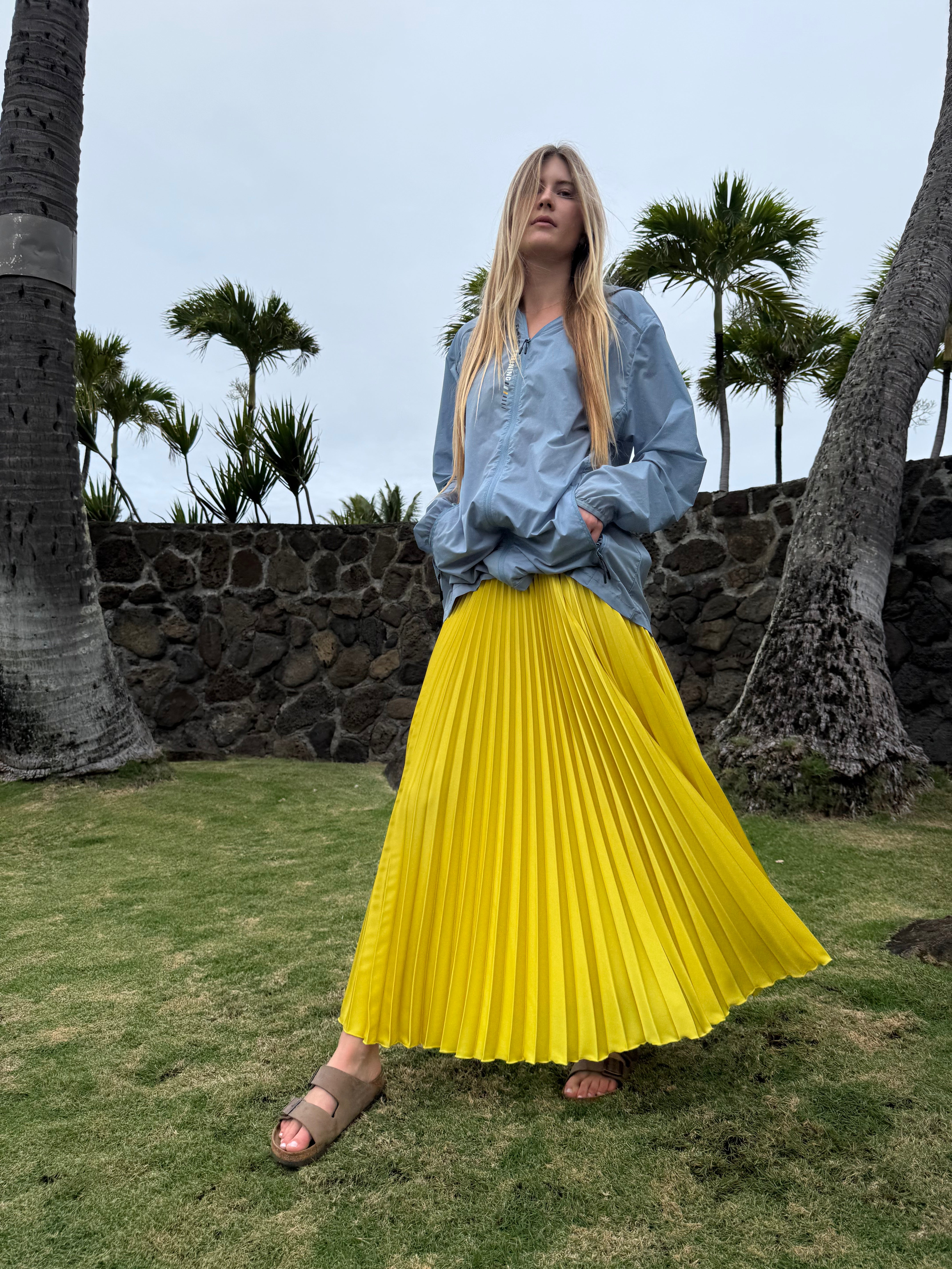our classic satin skirt is crafted out of flowy charmeuse and perfectly pleated in a full sunburst design