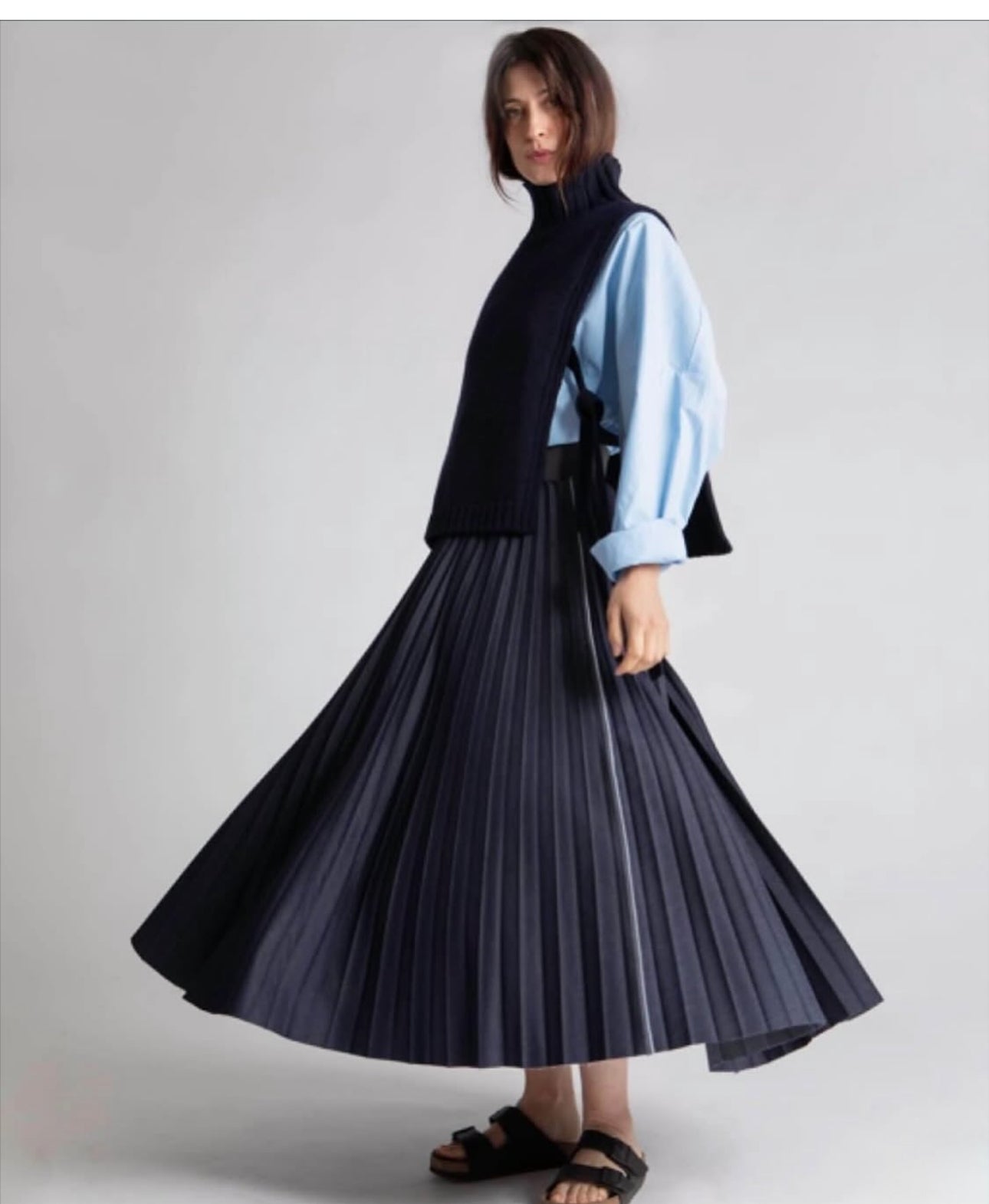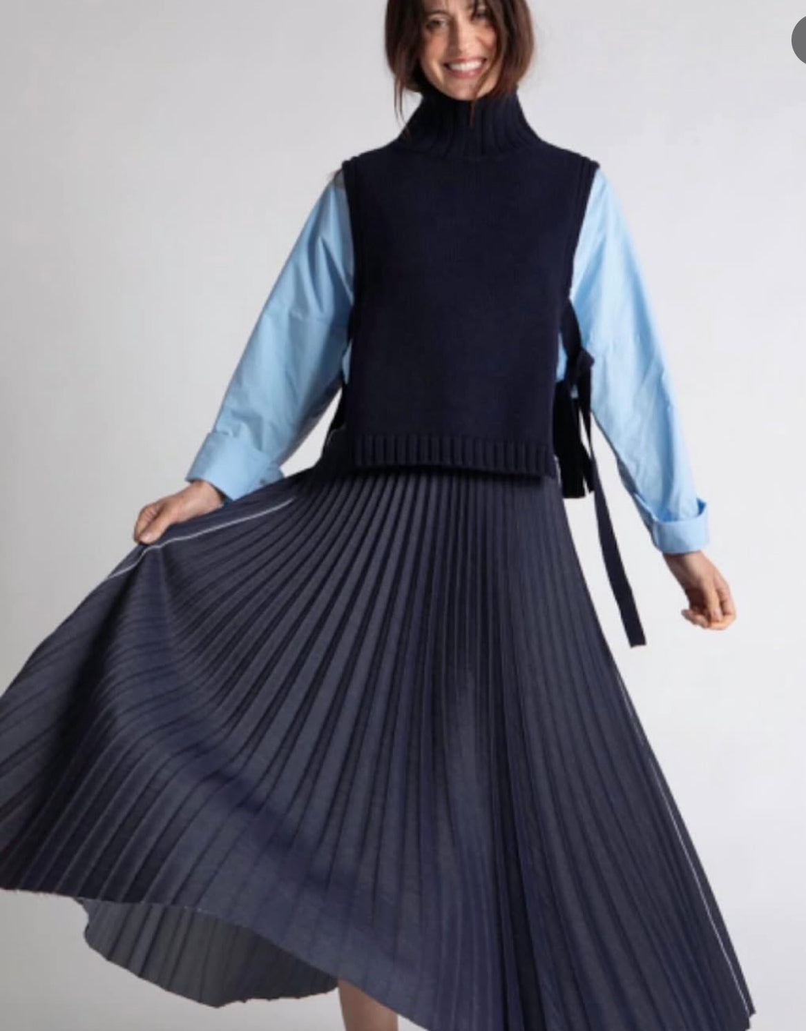 casual yet sophisicated this skirt is crafted in indigo japanese denim and hand pleated locally in an artisan factory.  the sunburst design features an unfinished hem and an exposed salvage side seam