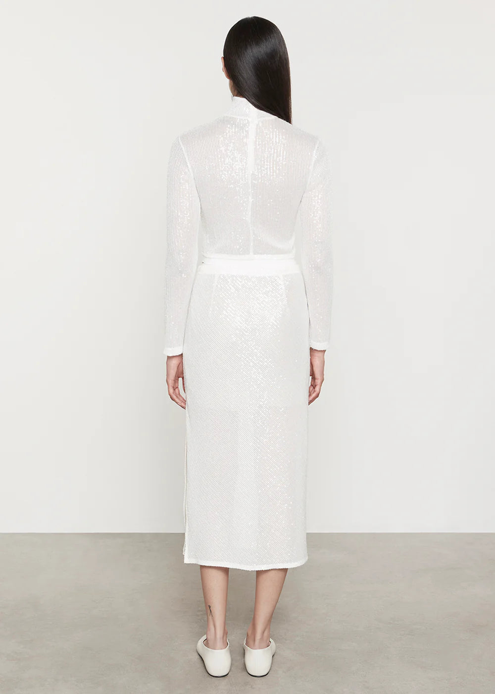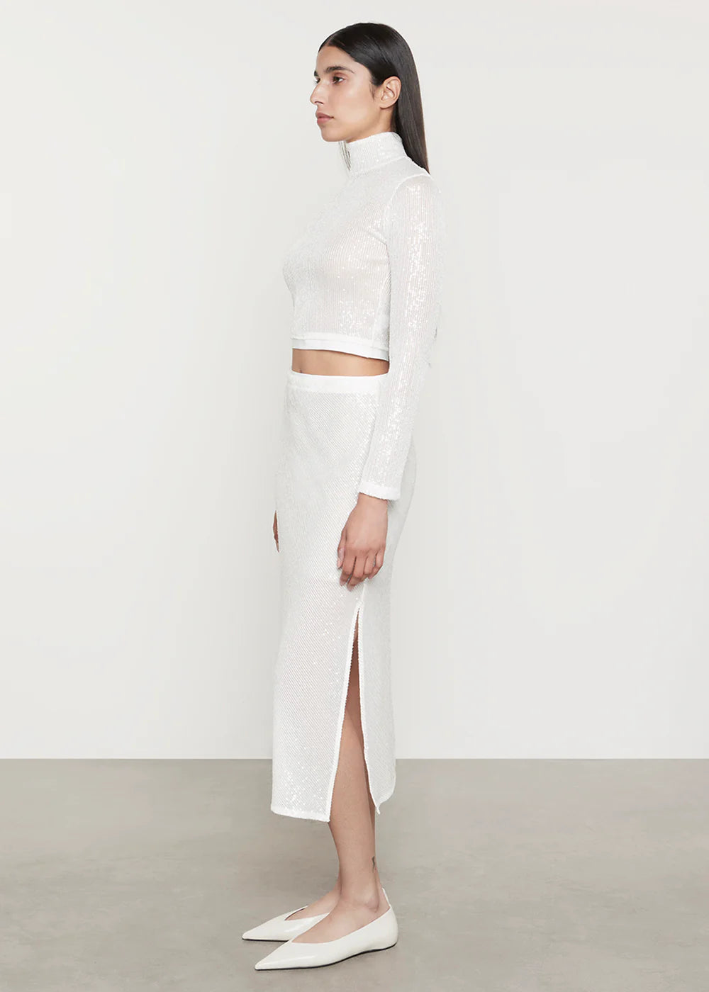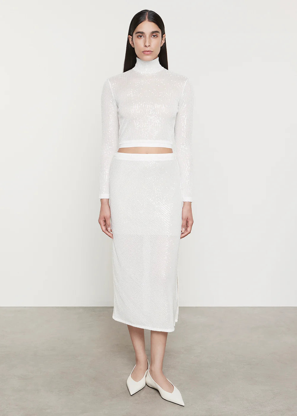 Our sequin skirt features an all-over embellished design, elastic waistband, and side slit for ease. Pair this bias cut skirt with our sequin mockneck for a coordinated, occasion-ready look, or with any of our tissue cashmere tops.