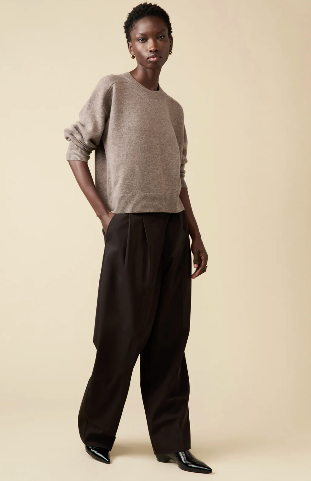 Relaxed fully-fashioned crew neck sweater with chunky rib trims. Signature center back detail.