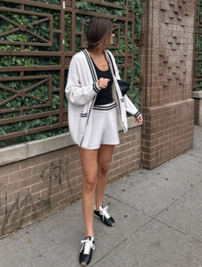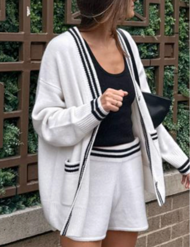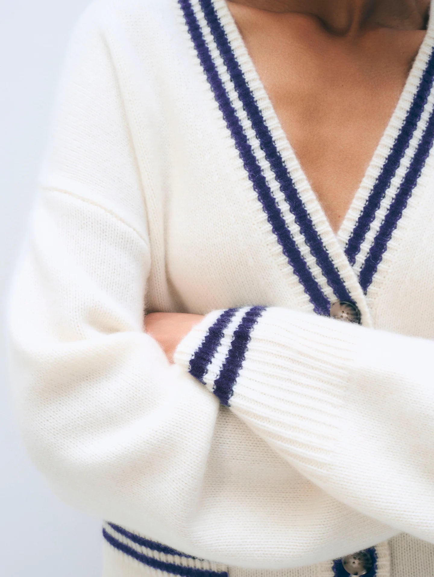 The ultimate throw-on-and-go layer. Crafted from three ends of cashmere for a structured drape, this boyfriend-style cardigan is finished with wide rib trims, contrast tipping, and clean patch pockets. Style back to the Cashmere Varsity Shorts to complete the look.
