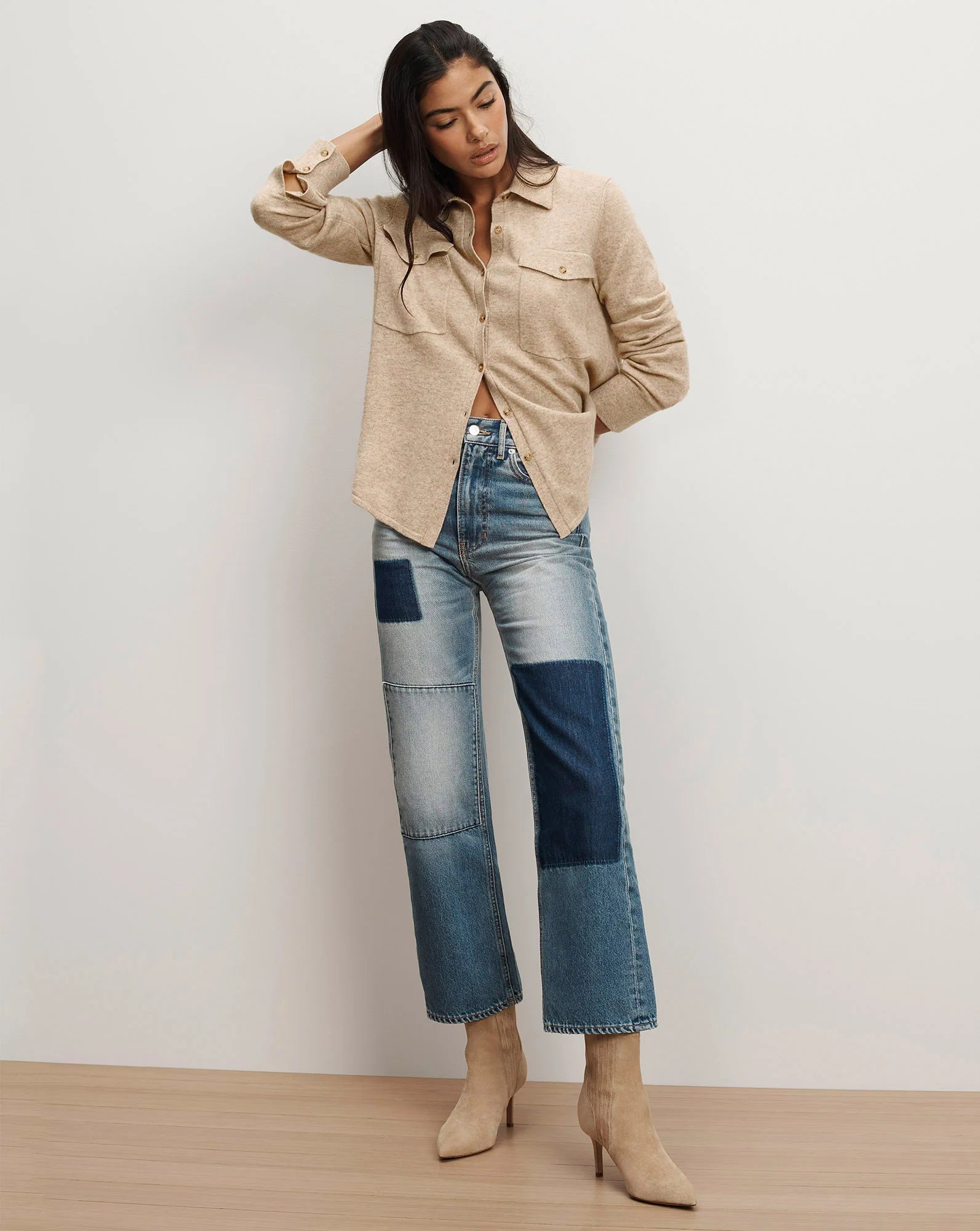 A luxe staple in any capsule wardrobe. Expertly spun from a soft merino wool-cashmere blend, the Ayton knit top features a classic button-down shirt silhouette with a collared neckline, front button placket, and double flap pockets. A rounded hem and cuffed sleeves complete the look. Understated and effortless, you’ll reach for this beige knit again and again—tuck into your favorite denim or pair with tailored trousers.