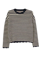 The Febo Pullover in Navy Stripe is a women’s cotton-blend crochet knit sweater in midnight navy and white.
