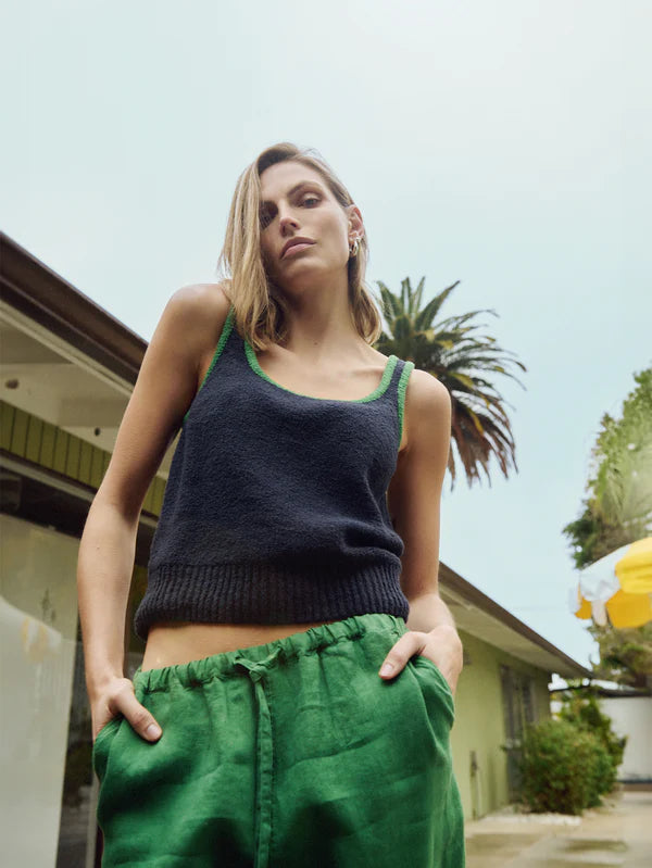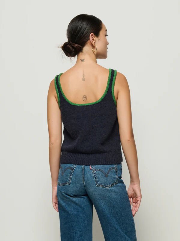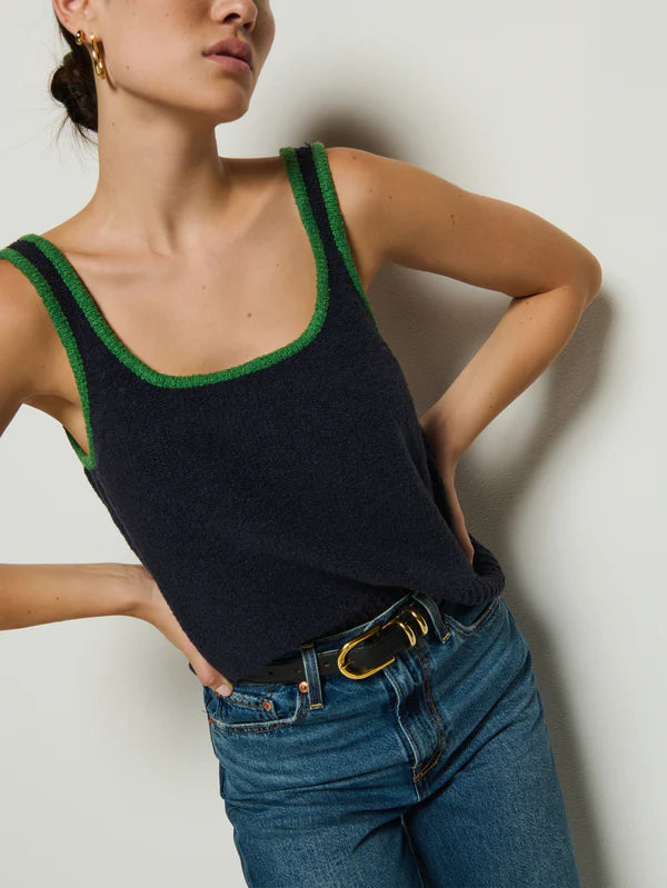 A little sporty, a lot chic. This textured knit tank features a contrast color band around the armholes and squared neckline with a ribbed hem and reverse jersey stitching throughout. This one comes in Night Sky.