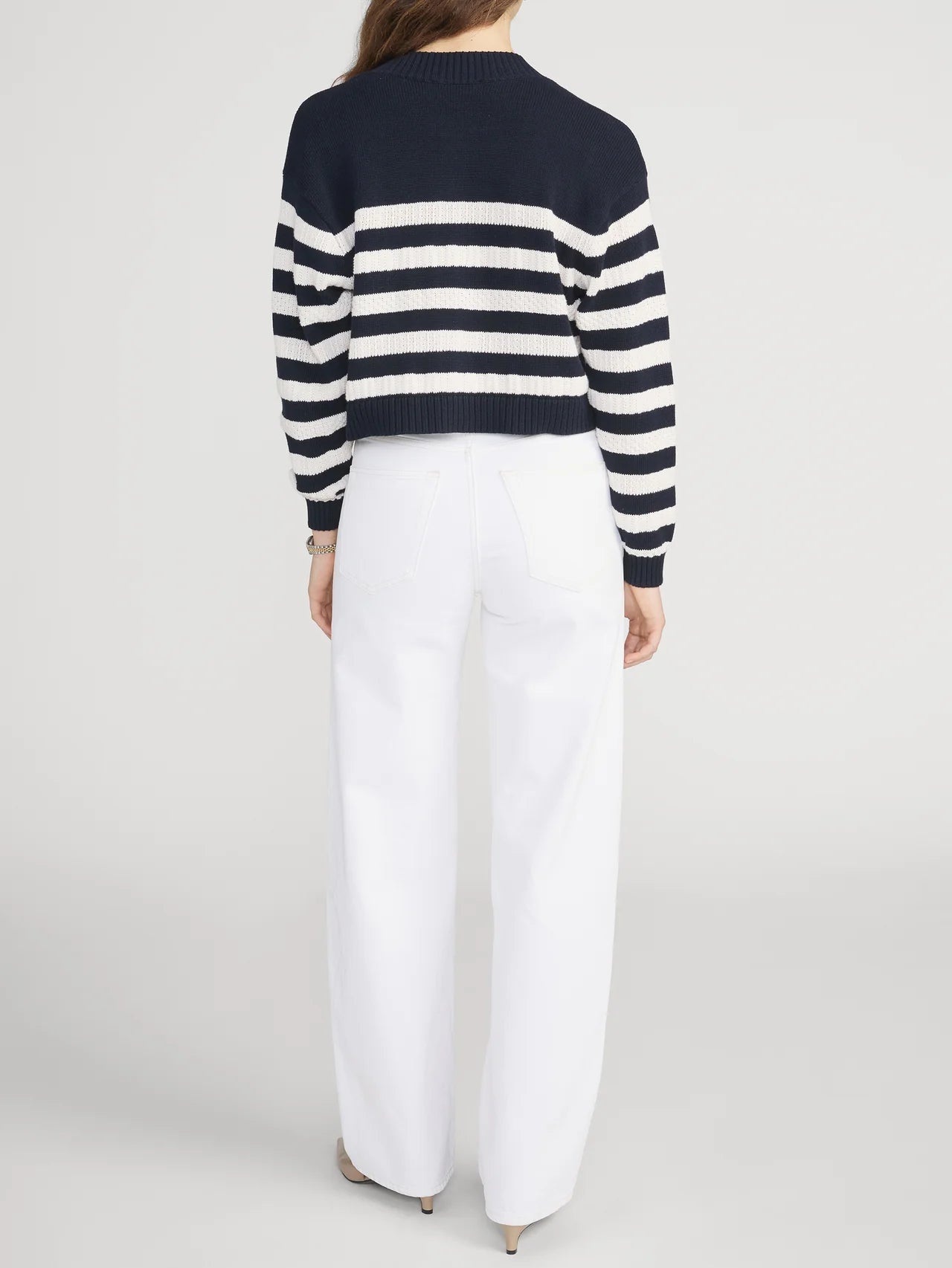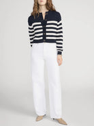A cropped cardigan with bold contrast. The Variation Femme Cardi features horizontal striping, a button-front closure, and a classic crew neckline. Finished with a close fit for a sharp, modern look.