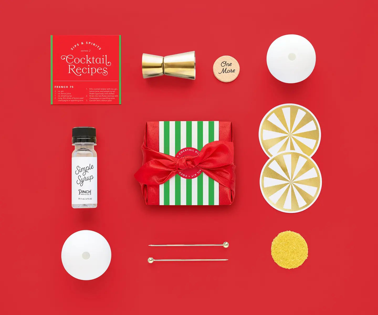 Inside, you'll find 8 merry mixology essentials: 2 spherical ice cube molds, 2 fl.oz. bottle of simple syrup, gold jigger, 2 gold cocktail picks, edible gold drink glitter, 2 coasters, a decision coin, and a cocktail recipe card.